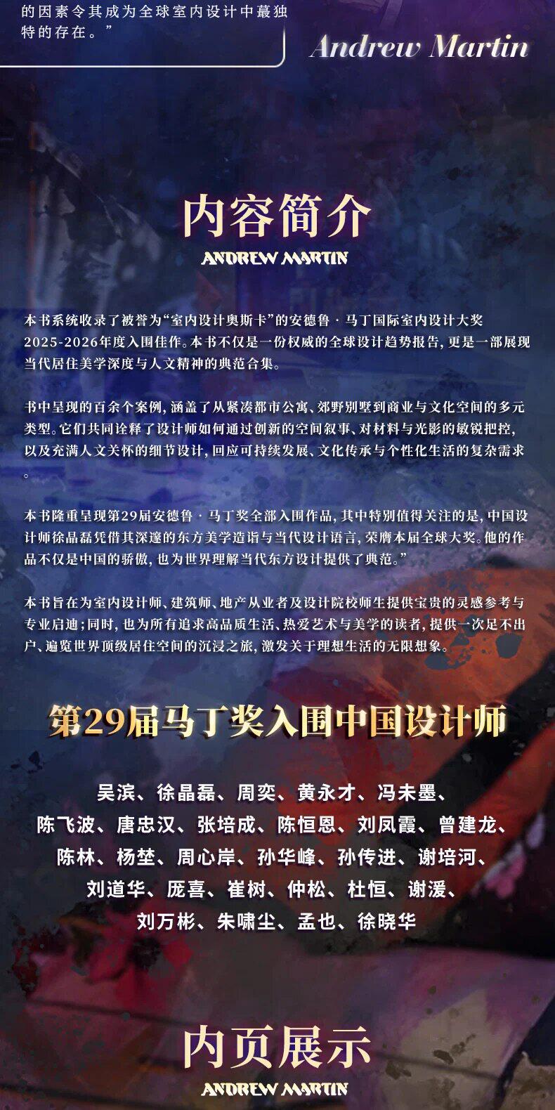 本書收錄的第29屆安德魯馬丁國際室內設計大獎作品,一如既往地代表全球居住美學的風向。但本屆重量級的篇章,屬於中國設計師徐晶磊先生——他榮膺本屆全球 大獎」 。這並非簡單的登頂,而是一場深刻的對話:他的作品以其獨特的東方哲思與當代語言,向世界闡述了何為“詩意居居”。這標誌著中國設計不再僅是追隨者的,,成為價值的定義者之一。