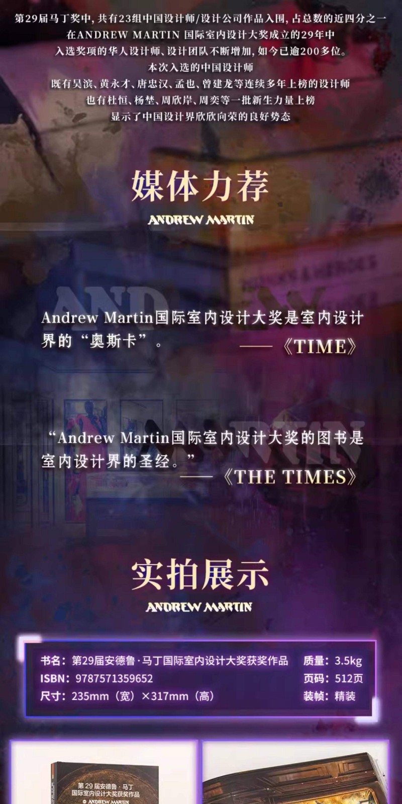 《第29屆安德魯馬丁國際室內設計大獎獲獎作品》旨在為室內設計師、建築師、地產從業者及設計院校師生提供寶貴的靈感參考與專業啟迪;同時,也為所 有追求高品質生活、熱愛藝術與美學的讀者,提供一次足不出戶、遍覽世界*級居住空間的沉浸之旅,激發關於熱愛藝術與美學的讀者,提供一次足不出戶、遍覽世界*級居住空間的沉浸之旅,激發關於理想生活的無限之旅。