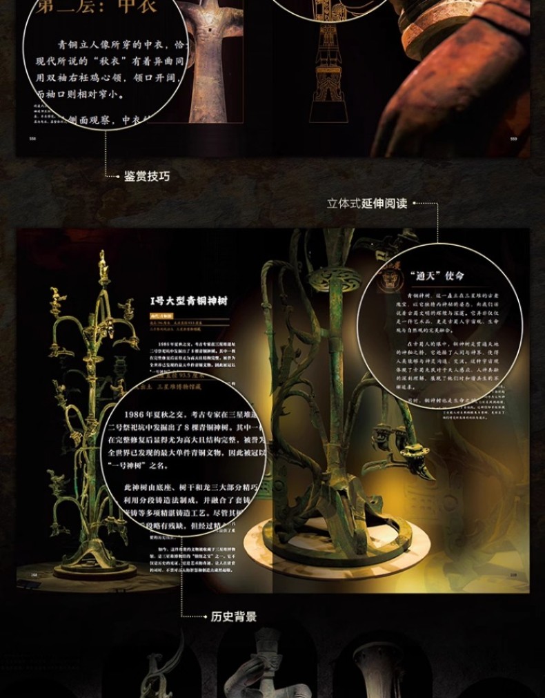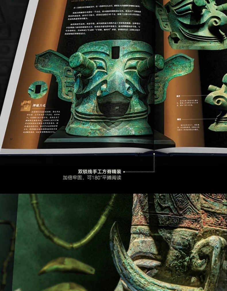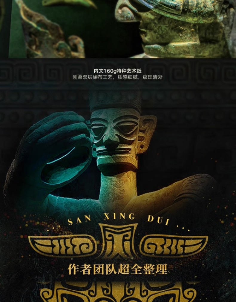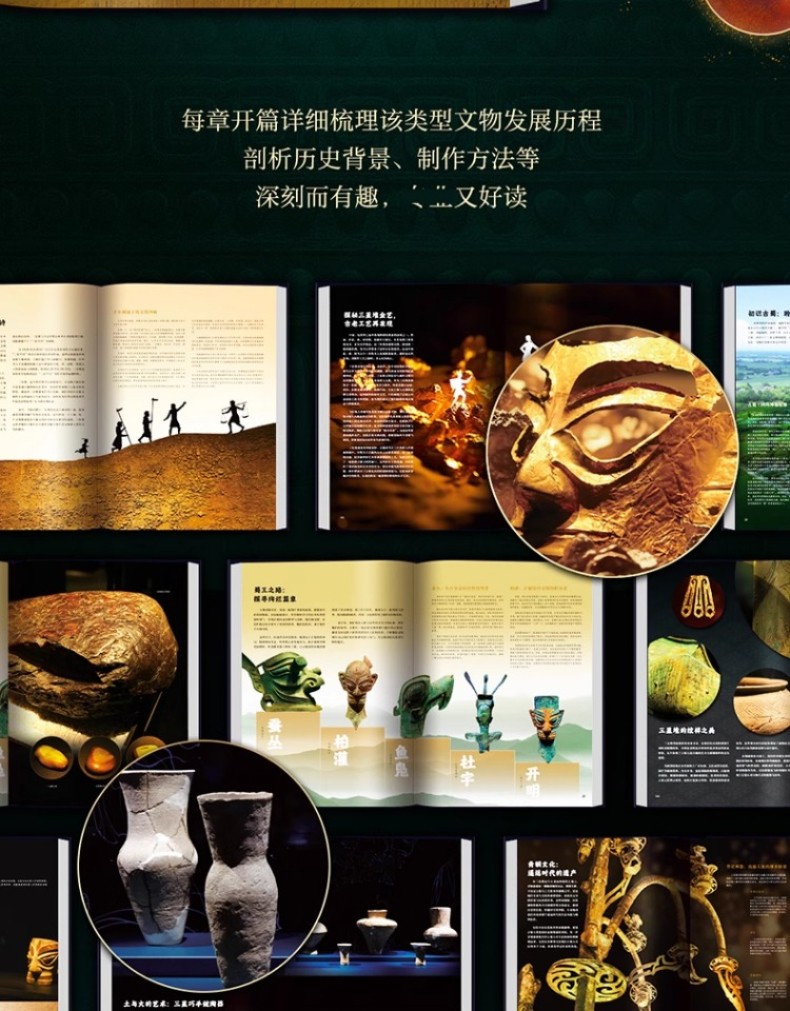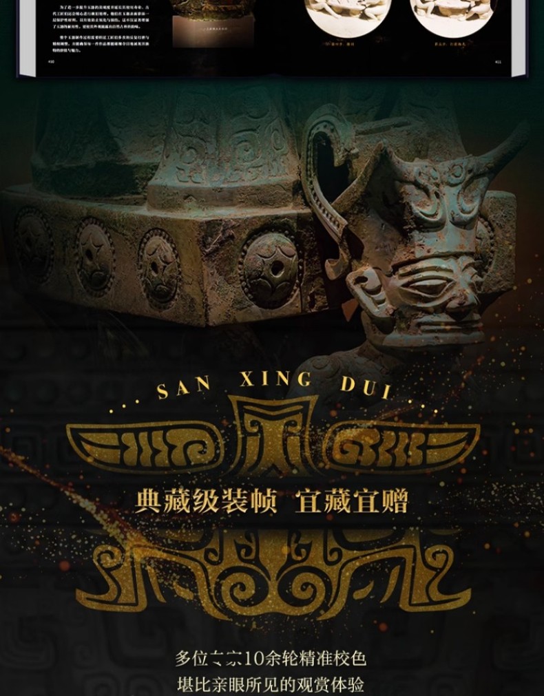 3.1375幅全類型彩圖,多角度定格三星堆奇妙風采:書中無論是對三星堆博物館的實拍還是藏品細節的放大,都採用高精度全彩圖,近1400幅高清彩圖,全方位呈現了信息實拍圖、細節放大圖、製作工藝圖、紋飾平面圖、三星級圖等方面超能多極尺寸的精彩圖譜而且書中特意採用了角度多樣的版式設計,融合專業的文物解讀和腦洞大開的拓展信息,各種拉線說明、知識補充,藏品全貌展示、局部細節放大、鑑賞技巧、紋樣圖展示、歷史背景,深度挖掘三星堆背後的歷史文化內涵。
