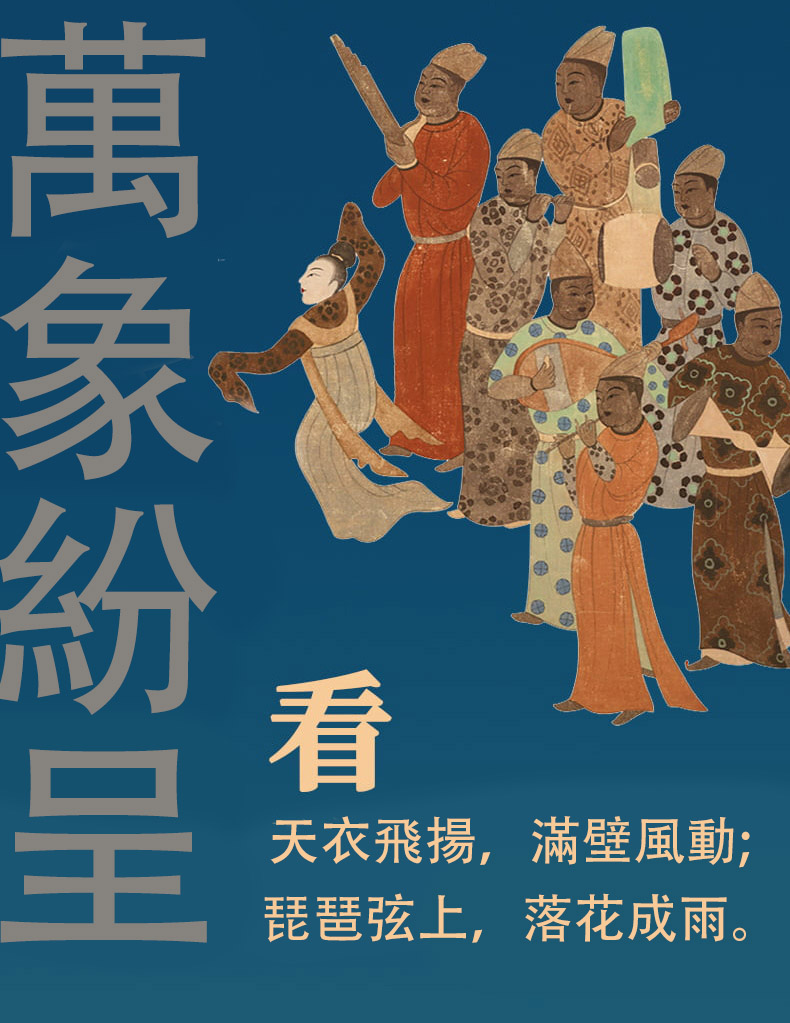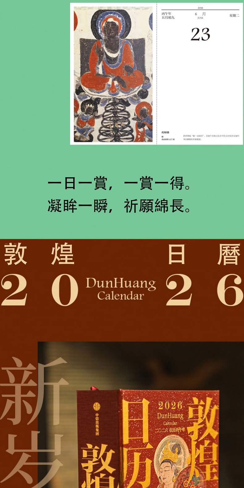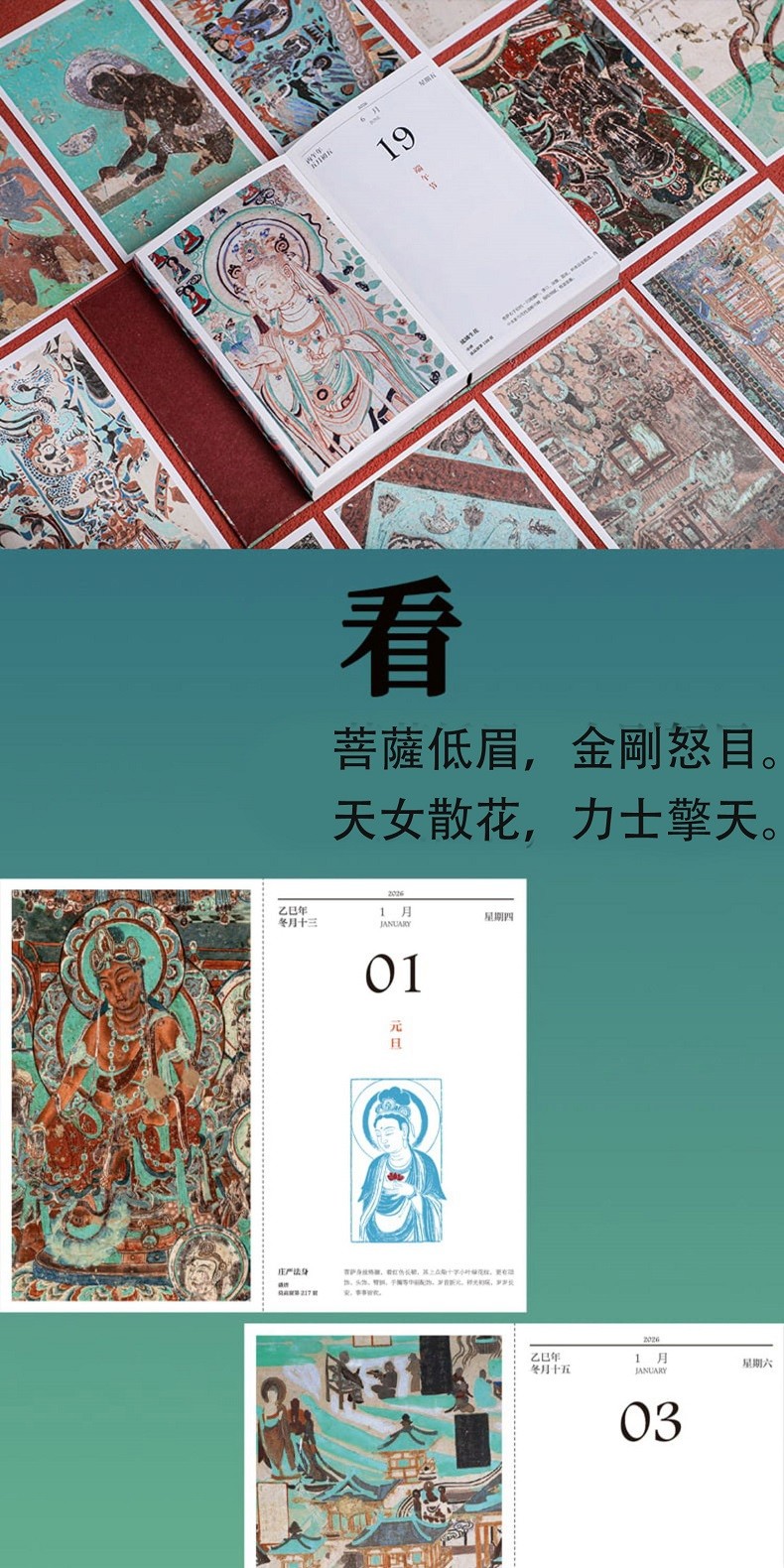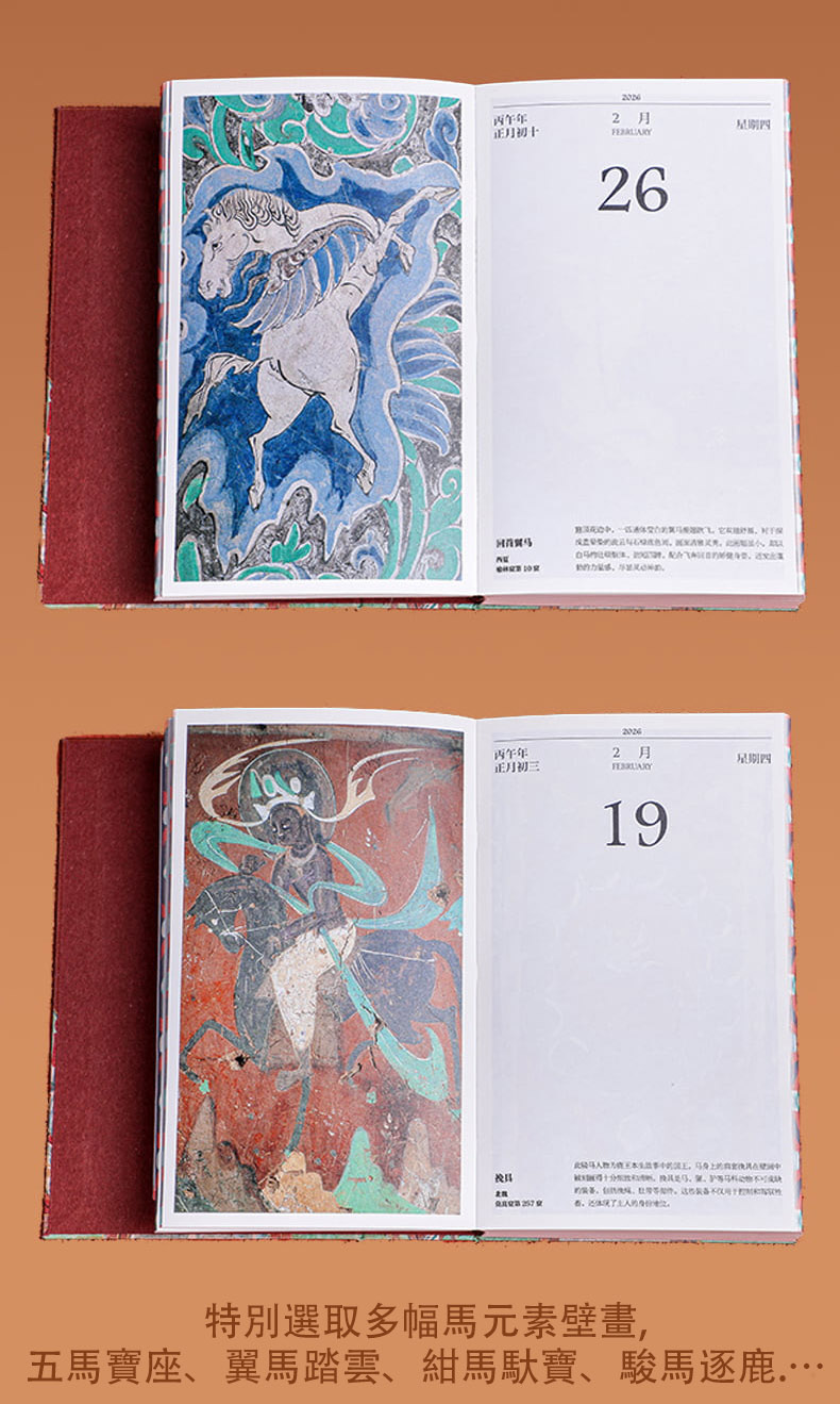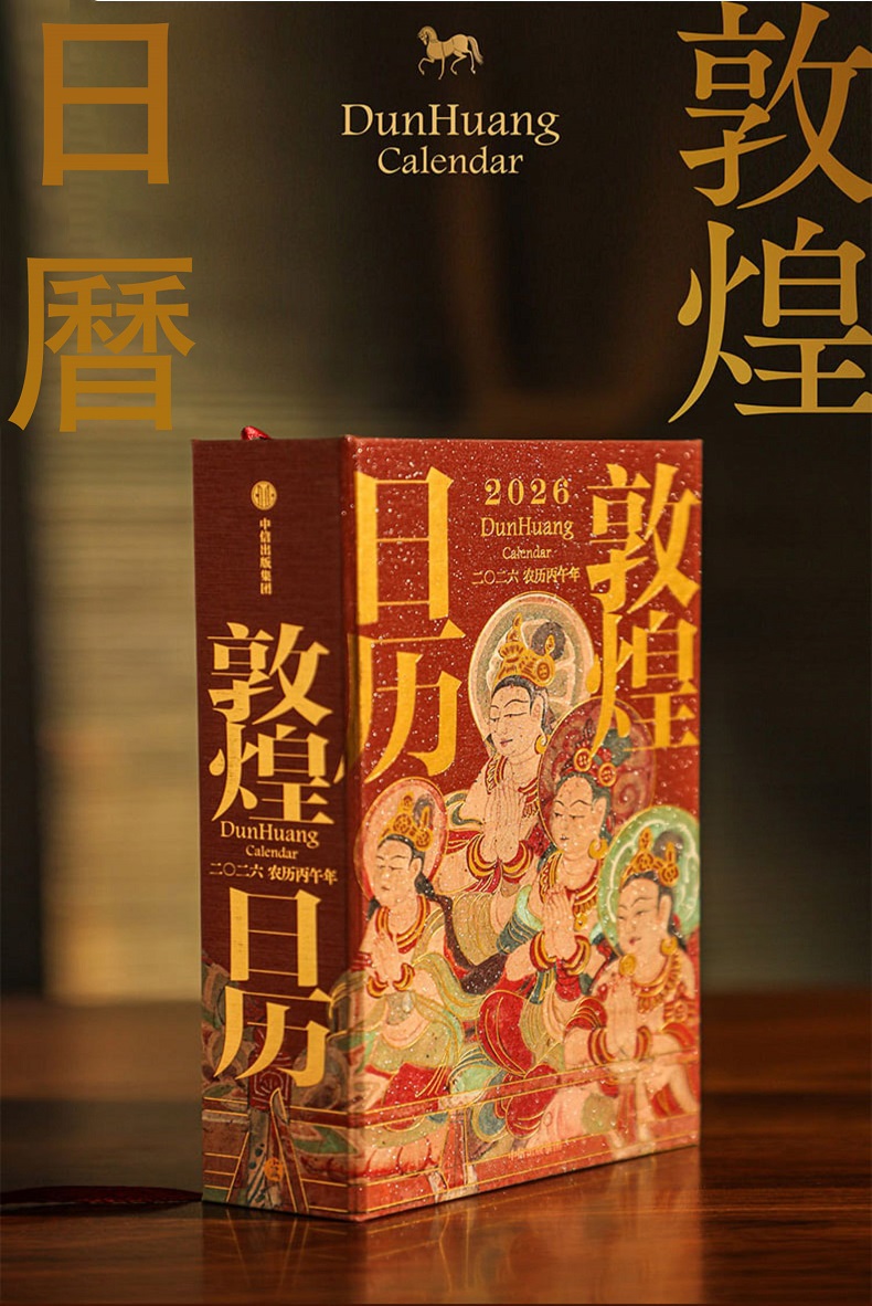 如是莫高,歲月凝光。璨然在壁,萬象奔來。敦煌研究院出品敦煌曆,2026年丙午馬年時序生輝。 甄選收錄335幅高清壁畫、30幅專家臨摹作品,特別選輯過往未公開的清晰細節。窮天下諫詭,盡人間麗飾。看天衣飛揚,滿壁風動,看琵琶弦上,落花成雨,看經變莊嚴,供養虔誠,看樂舞翩躚,法音繚繞,看菩薩低眉,金剛怒目,天女散花,力士擎天。 除夕日,莫高窟31窟《多寶塔》,聽塔鈴清響,新歲將至,圓滿遞增。 正月初一,莫高窟144窟《日天》,赤輪高懸,白馬踏春,日神乘坐五馬寶座,五駿馳騁,踏開一年新歲。 2 正月初五,榆林窟15窟《吐蕃財神》,瓔珞掛身,寶雨盈庭。 寒衣節,莫高窟202窟《樹上生衣》,願寒衣化暖,歲月生春。 冬至日,莫高窟156窟《舞樂圖》,瑞雪護佑,照破歲寒。 …… 既有佛國淨土,也繪人間百相。駝鈴叮咚,商賈往來雲集;青廬帳下,新人共牢而食;庖廚騰香,樂舞催宴;獵騎如風,羽箭穿雲;百戲雜陳,萬......