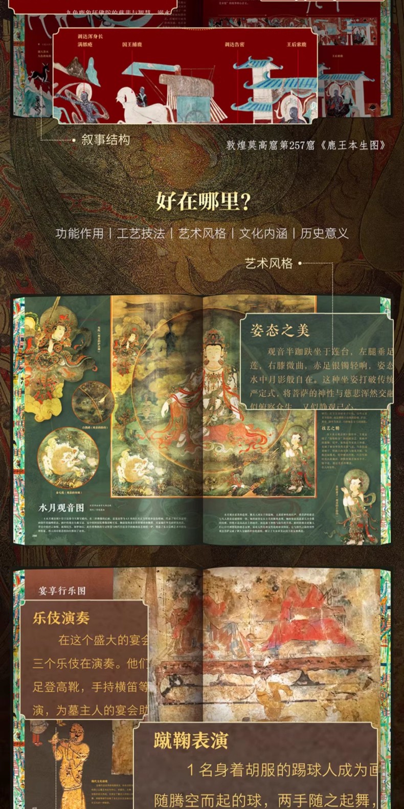 3. 1000張高清絕美插圖,搭建中國壁畫終極視覺檔案庫:既有壁畫全景圖,也有局部圖、細節圖帶領讀者近距離欣賞每幅壁畫,連壁畫斑駁的肌理,以及畫中人物的神態、衣紋都清晰可見,將東方美學展現地淋漓盡致,讓讀者在潛移默化中提升美學素養。還有多幅實拍圖、空拍圖展示壁畫的實際位置、分佈,讓讀者得以全方位、多角度觀賞中國壁畫。
