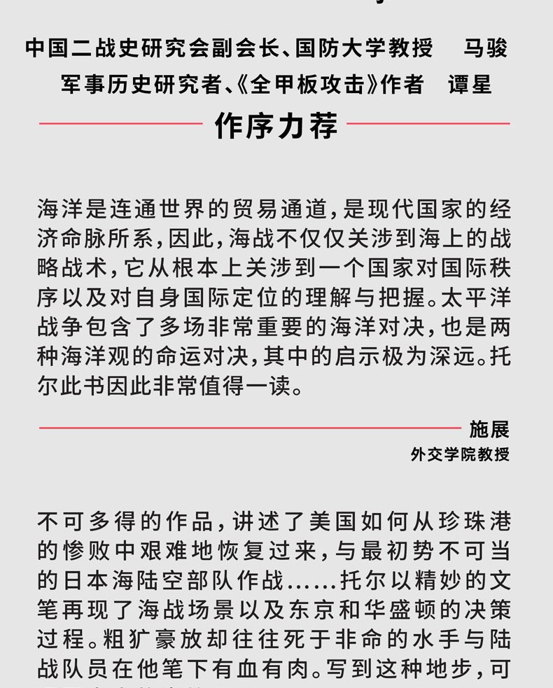 突破陸戰為主的視角,揭示航母興起和人類海戰思維蛻變的歷程 太平洋戰爭當中的海戰不僅對戰局本身起著決定性影響,也顛覆了自古以來的海戰方式,重塑了人類對海戰的理解。然而原有的太平洋戰爭經典作品往往重陸戰而輕海戰,無法真正呈現太平洋戰爭的全貌。托爾的鉅作從全面的海戰視角鋪陳開來,展示了航空母艦取代「大砲巨砲」成為海軍核心的曲折歷程,彌補了這個缺憾。