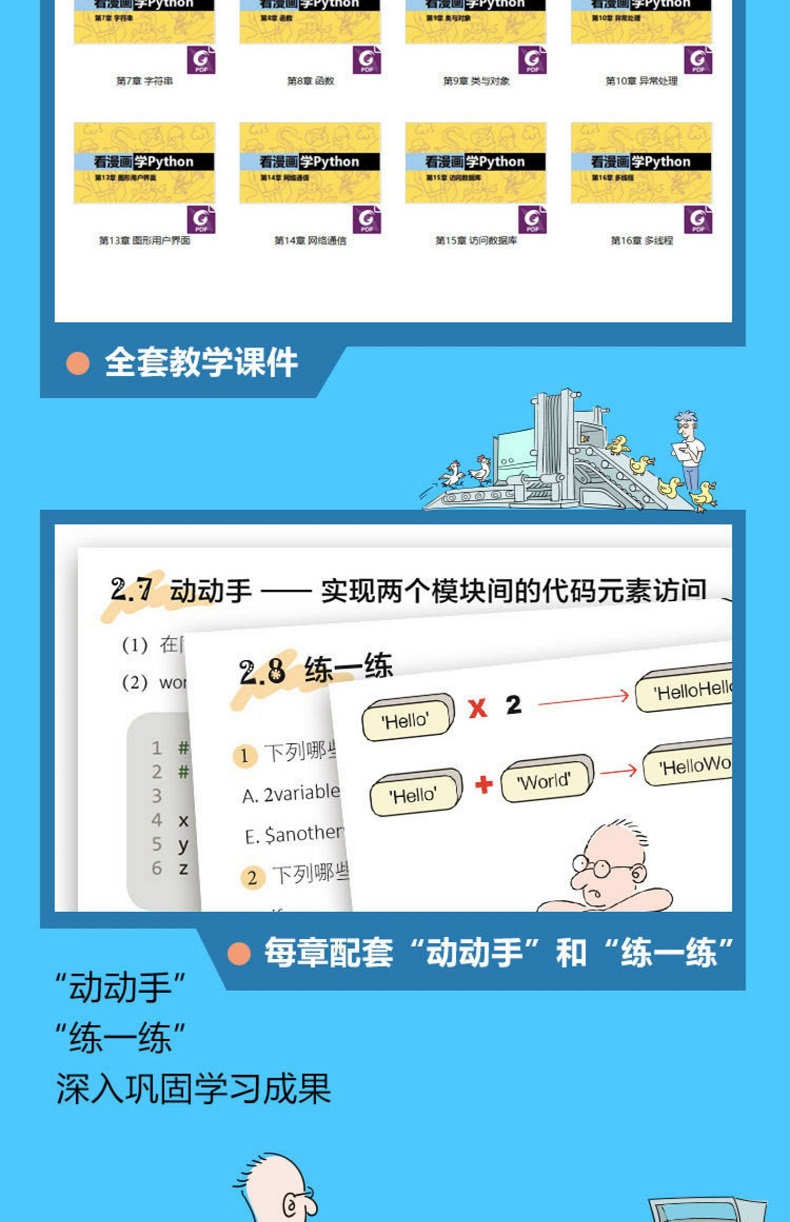《看漫畫學Python:有趣、有料、好玩、好用(全彩修訂版)》在每一章中都安排了「動動手」環節,您可在該環節找到應用實例;在每一章結尾都提供了「練一練」環節,您可在該環節找到同步練習題。