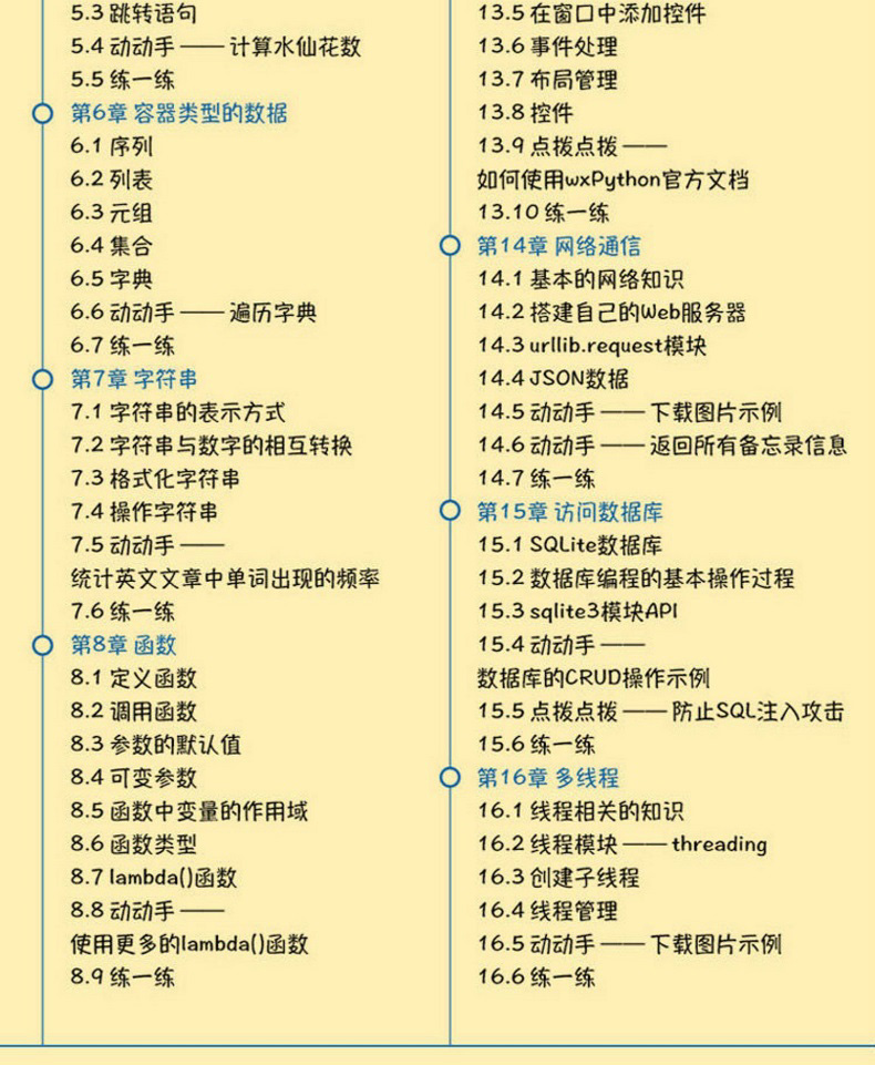 本書貫穿了動手實踐環節,旨在幫助讀者完成書中示例並及時消化書中知識點。如果您想提升Python技能,則無論您是想學習編程的小學生,還是想參加計算機競賽的中學生,抑或是計算機相關專業的大學生,甚至是正在從事軟件開發的職場人,本書都適合您閱讀和學習。