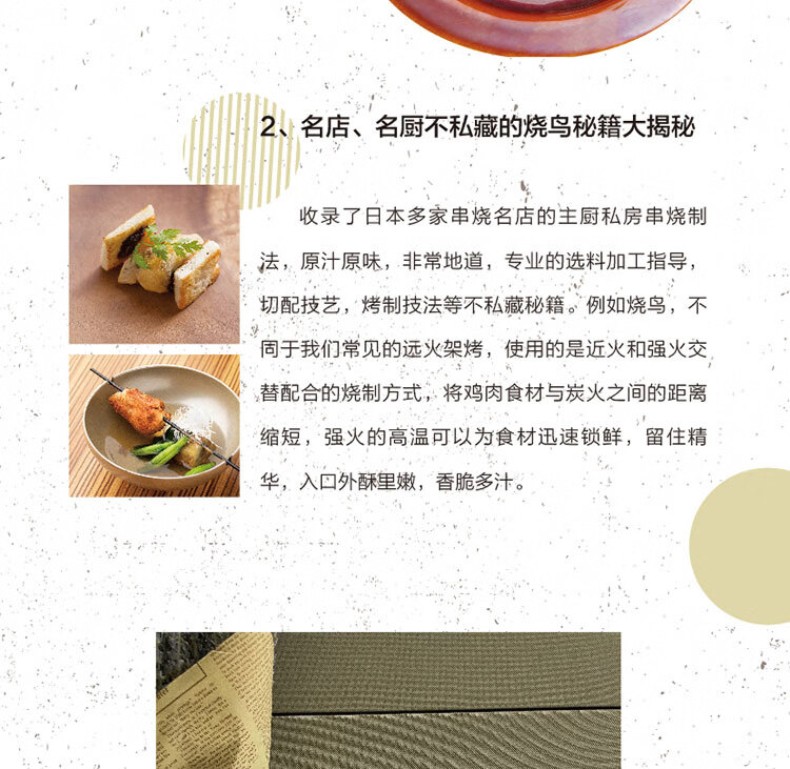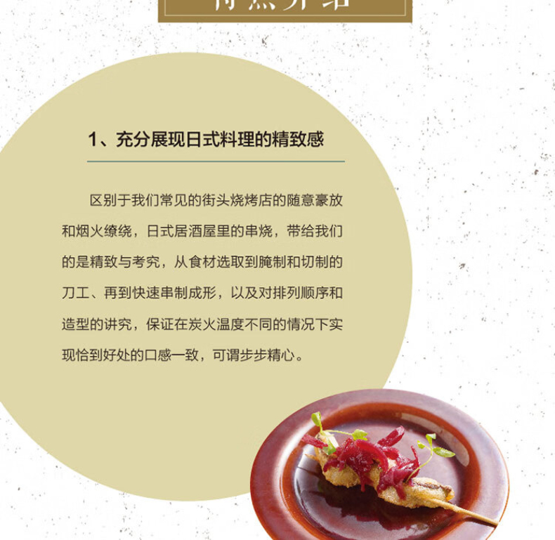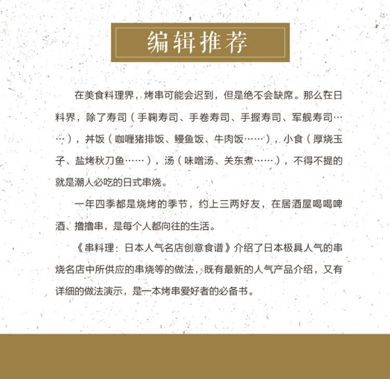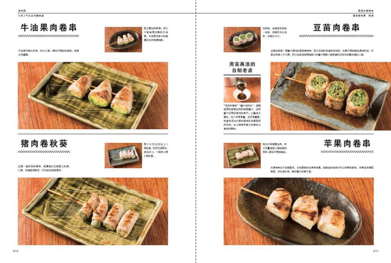 《串料理:日本人氣名店創意食譜》精緻串燒/燒鳥,邀您共享居酒屋美食! < 在美食料理界,烤串可能會遲到,但是絕對不會缺席。那麼在日料界,除了壽司(手鞠壽司、手捲壽司、手握壽司、軍艦壽司……),丼飯(咖哩豬排飯、鰻魚飯、牛肉飯……),小食(厚燒玉子、鹽烤秋刀魚……),湯(味噌、關東煮菜……),不得不提的就是潮燒潮。 < 一年四季都是烤肉的季節,約三兩好友,在居酒屋喝喝啤酒、擼擼串,是每個人都嚮往的生活。
