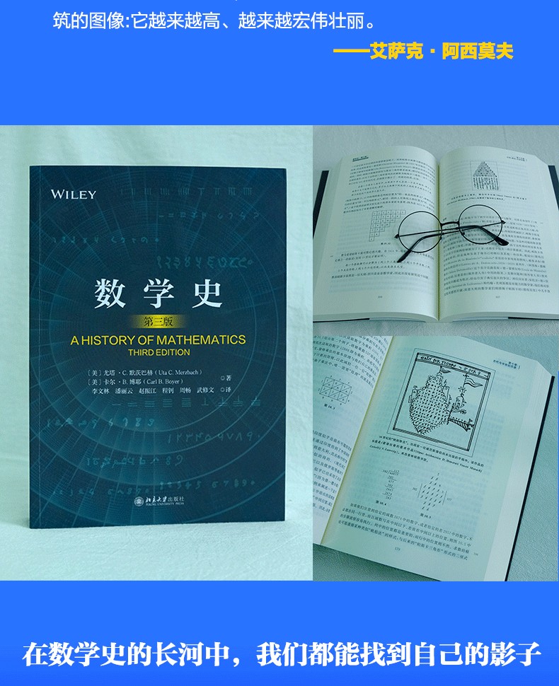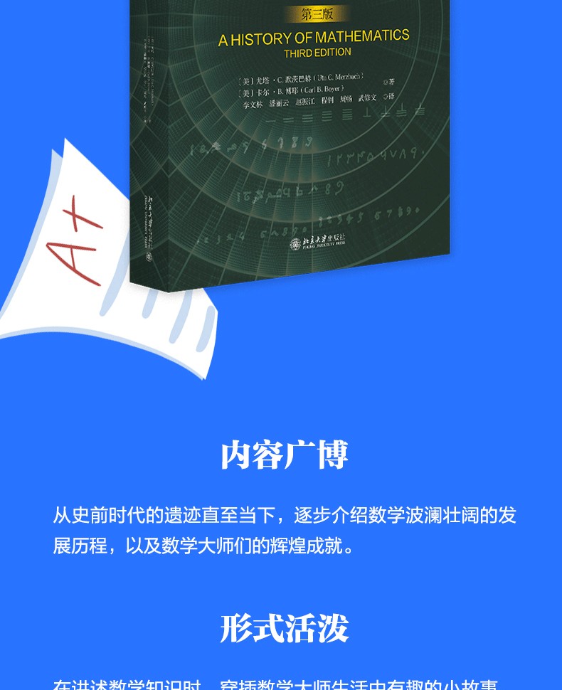 《數學史(第三版)》由國際科學史研究院院士卡爾·B.博耶和哈佛大學數學與科學史博士尤塔·C.默茨巴赫所著,博耶和默茨巴赫按照時間、空間和學科演化三個維度,把數學幾千年的發展濃縮為這本引人入勝的編年史。本書涵蓋了數學發展的整個歷程,可以對數學獲得一個完整的認知。從希臘人到哥德爾,數學一直輝煌燦爛,名人輩出,觀念的潮漲潮落到處清晰可見。而且,儘管追蹤的是歐洲數學的發展,但作者並沒有忽視中國文明、印度文明和阿拉伯文明的貢獻。毫無疑問,這本書是一部經典的關於數學及創造這門學科的 數學家們的單卷本歷史著作。進入21世紀,數學高速發展,許多學科獲得突破性的進展,本書的第三版同時做了更新,使得數學史更加完整。特別值得一提的是,本書視野開闊,並沒有侷限於西方視角,對於古代中國的數學發展也有較詳細的介紹和相當中肯的評價。本書獲得了學界高度的認可,具有很高的學術性;同時,由於本書的語言簡練,通俗易懂,具有很強的可讀性強。我們為書中的史實、觀念、精美插圖以及引領我們走過數學發展長河的大師們所折服,遂決定把它引入中國,以颯中國熱愛數學,崇尚科學精神的讀者。