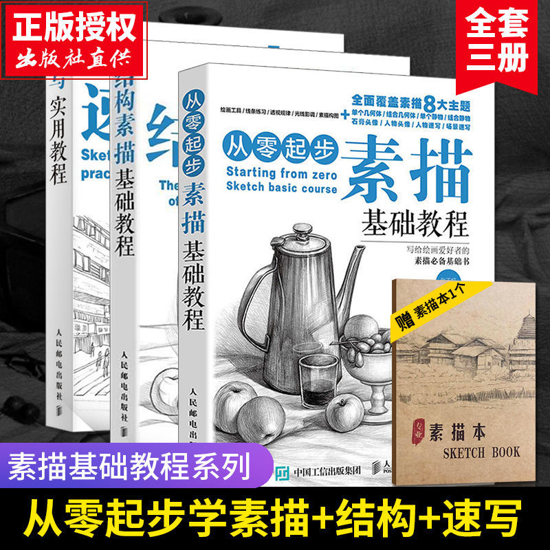 從零起步學素描3冊 基礎教程書+結構素描速寫書 鉛筆劃臨摹 靜物風景人物石膏頭像 美術手繪畫冊 ( 送素描本)