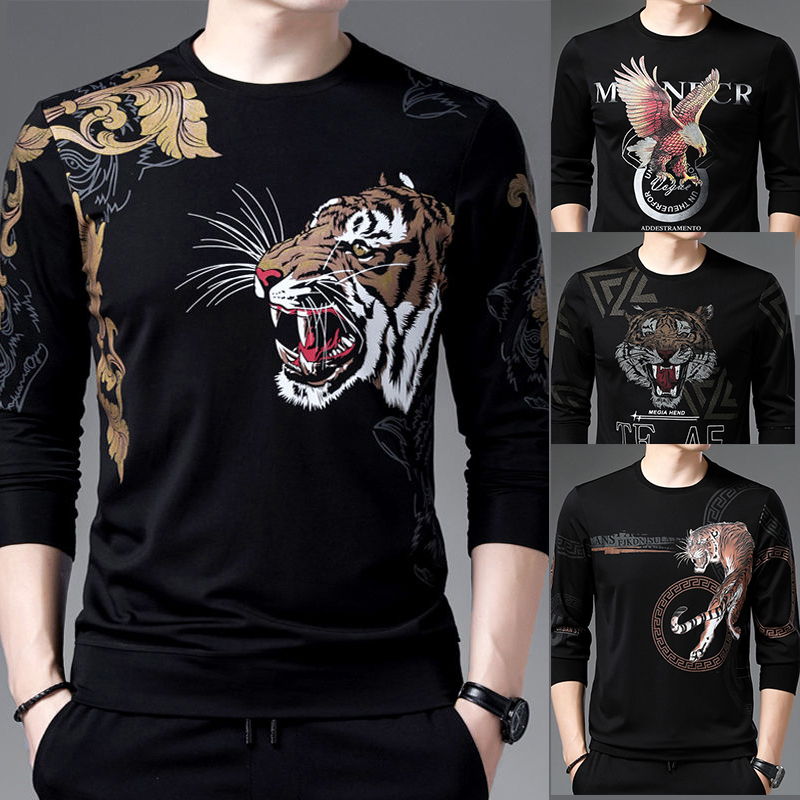 印花虎虎生威 新款男士時尚圓領長袖T卹 春秋季打底衫衛衣 冬款加絨加厚男裝上衣(12款圖案任君選擇)