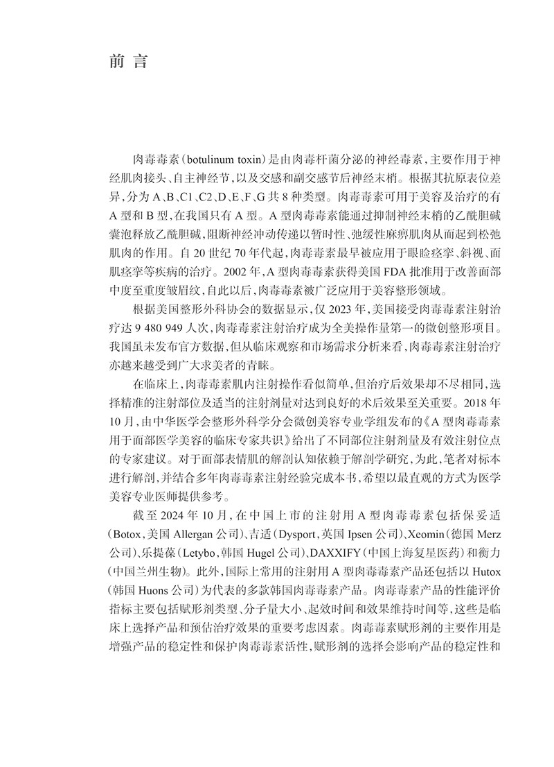 臨床上,肉毒素肌肉注射操作看似簡單,但治療後效果卻不盡相同,選擇精準的注射部位及適當的注射劑量對達到良好術後效果至關重要。本書從解剖著手,以屍體解剖圖片結合示意圖的形式,將面部注射技巧及要點一一敘述,由淺入深,將目前常見註射美容所涉及的解剖理論基礎以及注射具體操作方式相結合,並加以視頻輔助,從零開始,由理論到操作,"手把手"教會面部注射,是肉毒毒素注射的入門級圖書。希望能夠幫助讀者掌握規範的注射手法,且做到知其然知其所以然。