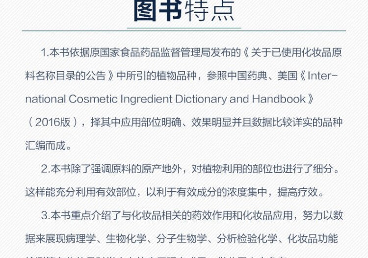 2.本書能夠幫助讀者快速建立對化妝品的基本概念、生產工藝過程和功能化原料的認識,方便對天然化妝品的工藝和配方進行選擇和進一步開發研究,也可指導讀者解讀化妝品中天然組分的功效,幫助廣大讀者選擇合適的化妝品;
