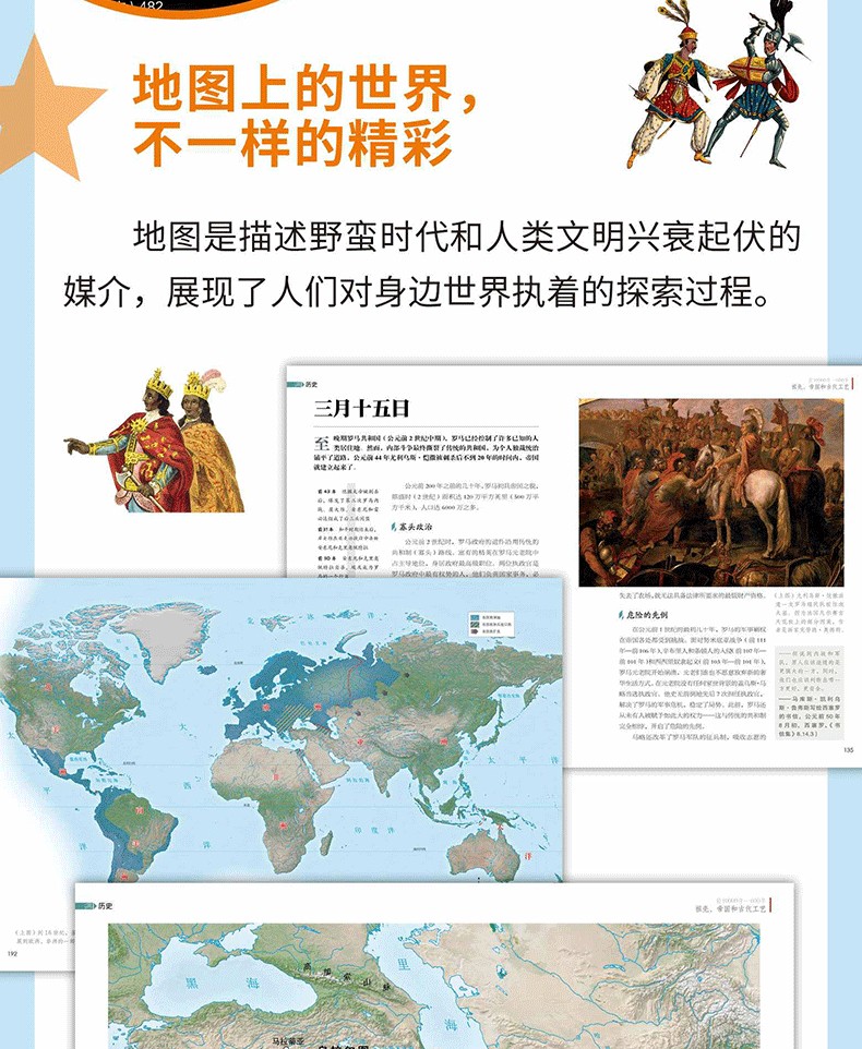 1.歷史發生在特定的時空中,沒有地圖的歷史顯然是蒼白無力的。《歷史》一書,含近240幅地圖,以地圖這個工具來講述當時發生的歷史事件,是國內第一套將地圖與歷史結合的世界史;