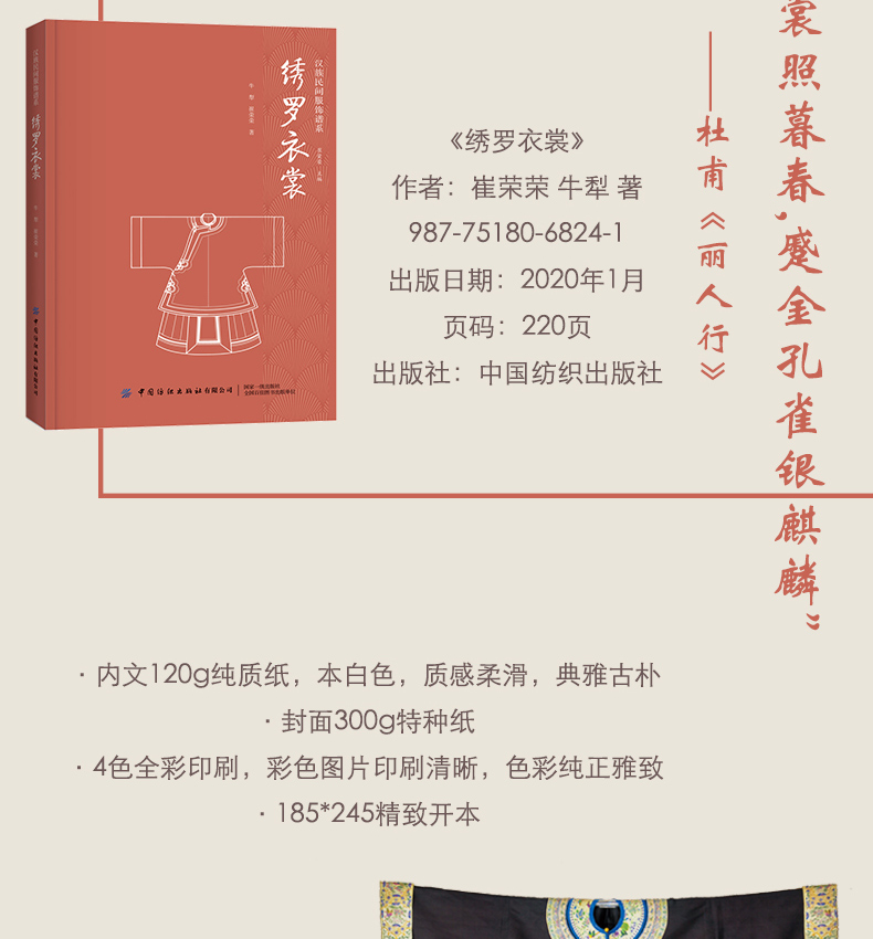 《旖旎錦繡》為“漢族民間服飾譜系”之一。本書依托江南大學服飾傳習館的館藏,結合其他博物館、機構以及私人收藏的漢族民間紡織品實物,對散落在民間的織、染、繡工藝進行調研與記錄,將民間紡織用品的織造、印染、刺繡技藝以及民間紡織品圖案的內容、形式進行全面的梳理,並從文化的角度加以分析,以期能夠引起廣大讀者對傳統織、染、繡技藝的更廣泛關注與興趣,讓更多的人參與到復興與傳承傳統技藝的工作中來,守護漢族民間服飾中蘊含的精神文化內涵,弘揚中華民族優秀傳統服飾文化的理論價值,促進傳統文化產業開發,彰顯古代勞動人民精神智慧。