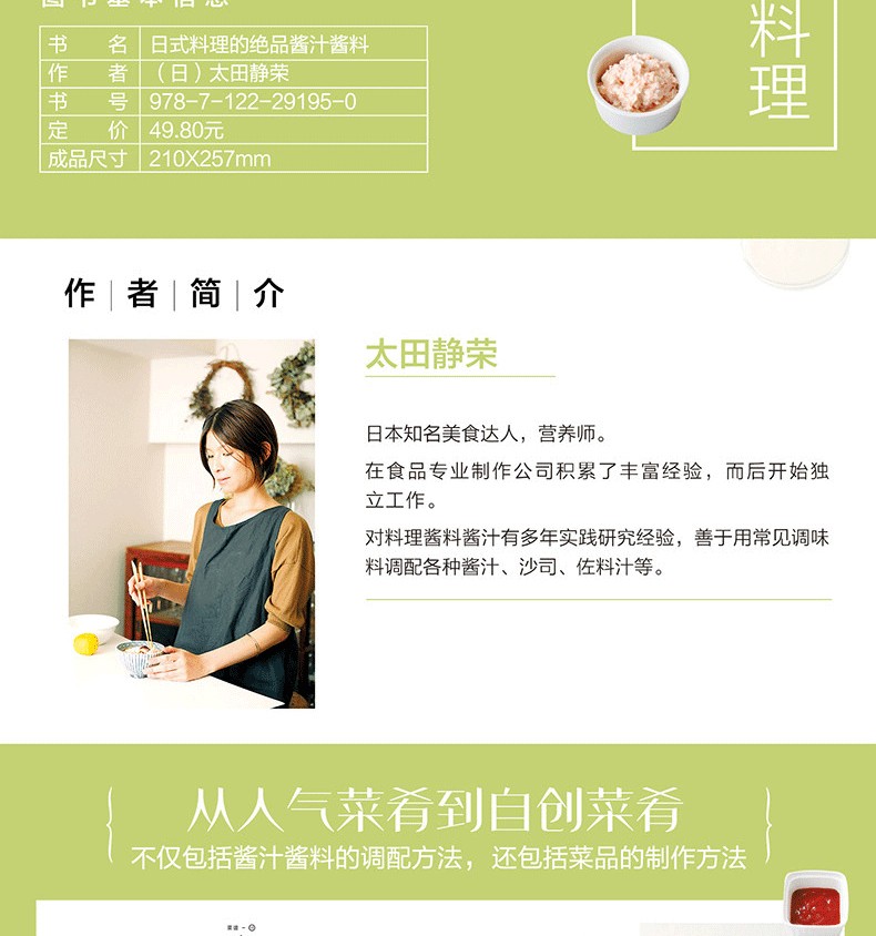 精選多國經典醬汁醬料,包括法國、意大利、日本、中國韓國和越南的地道配方,在經典配方基礎上又發散出多種變化搭配,為傳統料理增色,激發廚房創意。西餐的紅酒醬汁、油類醬汁、日本的味噌調料、韓式辣椒醬等,都有單獨分類,並全面收錄細分品種,方便查找。 201種醬汁料理製作步驟清晰完整,適合餐廳、酒吧、居酒屋、咖啡廳的各位店主參考使用。