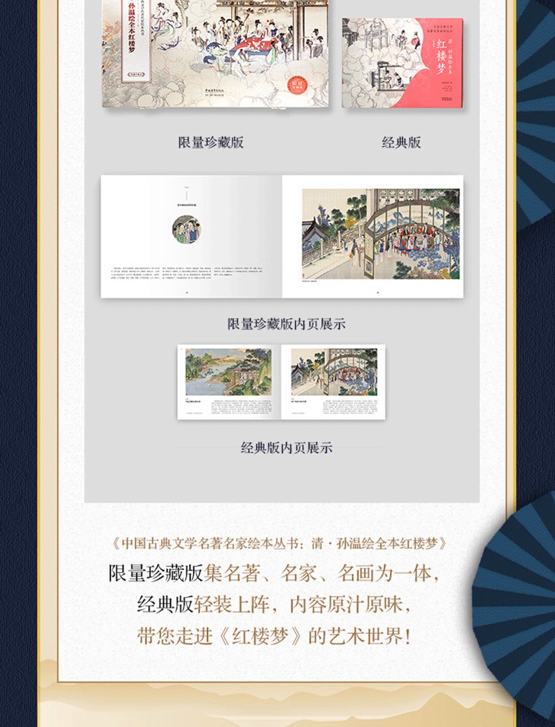 本書透過230幅絹本彩繪再現《紅樓夢》的主要故事情節、人物和場景。橫開本採用裸脊鎖線裝訂,可實現180度無障礙展開閱讀,內文仿古特種紙精確還原畫作色彩和細節。同時,書特聘請中國紅樓夢學會權威專家為每幅畫面撰寫文字,圖文交相輝映,形成一部「節本」《紅樓夢》,為讀者用最短的時間閱讀中國古典名著提供了難得的素材。 2019年,中國青年出版社與全球頂尖出版商合作出版了該書的中、英、法、意四個語種的限量珍藏版,創造了《紅樓夢》首次中、英、法、意四個語種同時出版的記錄。特裝刷邊版《清.孫溫繪全本紅樓夢》(經典版)保留了限量珍藏版的原有圖文,並以16開軟精裝的形式再次出版,同時精選經典場景圖對書進行刷邊,進一步提升收藏價值,讓更多的讀者有機會了解中國文化和《紅樓夢》這一文學巨著,並透過此書獲得一種美的閱讀感受。