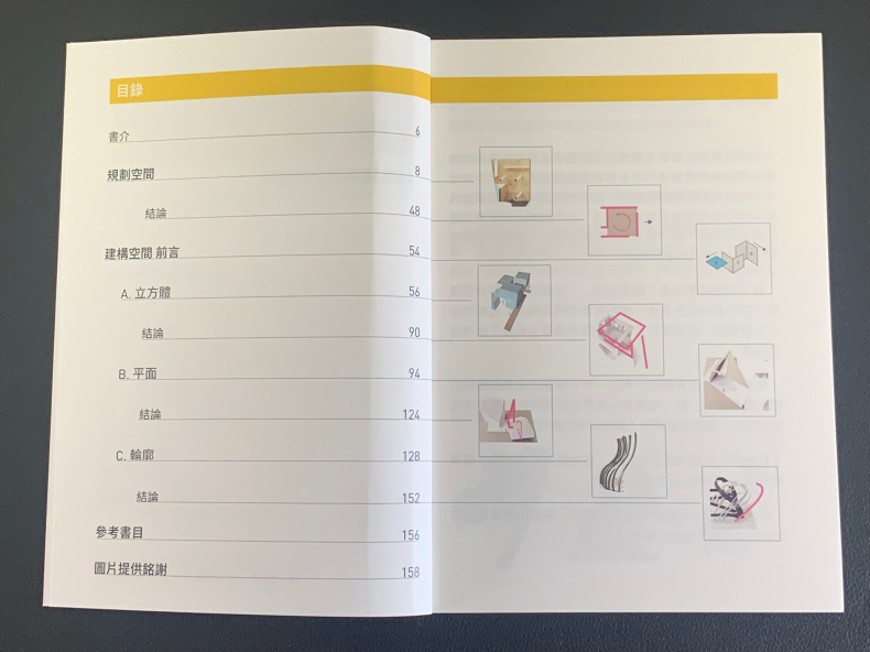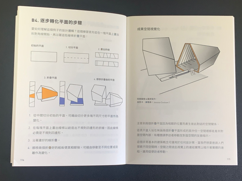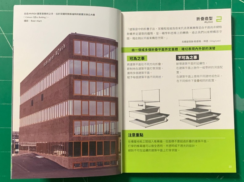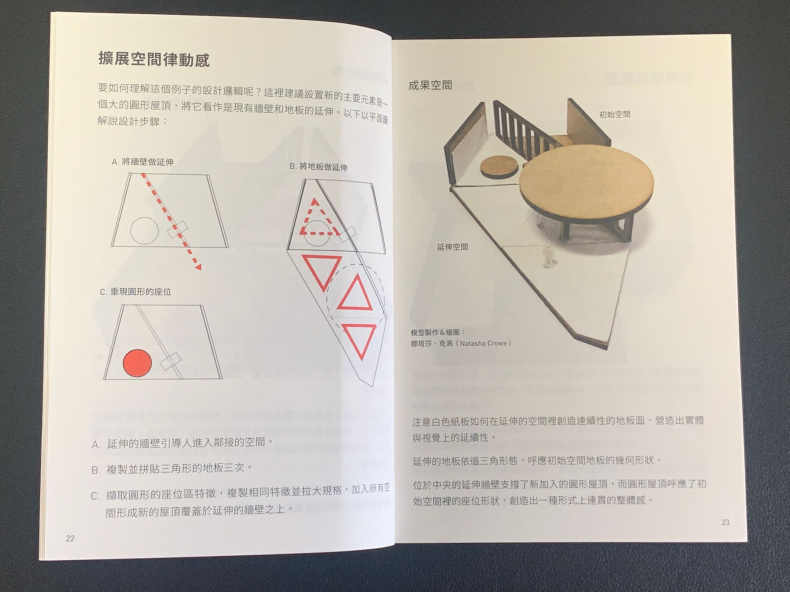 全書藉由圖示與實體縮小模型逐步解說當代空間構成的方法如折疊平面或結合曲線的設計。每一章開頭都以世界公認現存的知名建築為例做解說,讓讀者更清楚了解應用方式與成果。