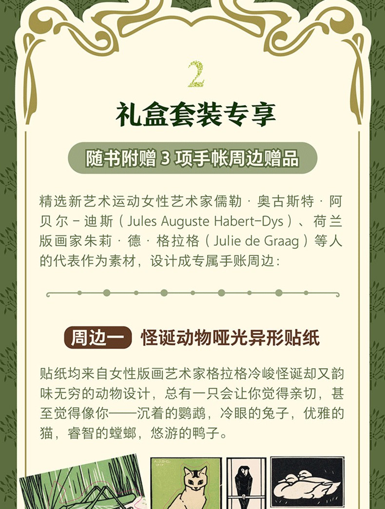 精選新藝術運動女性藝術家儒勒·奧古斯特·阿貝爾-迪斯(Jules Auguste Habert-Dys)、荷蘭版畫家朱莉·德·格拉格(Julie de Graag)等人的代表作為素材,設計成專屬手帳週邊。