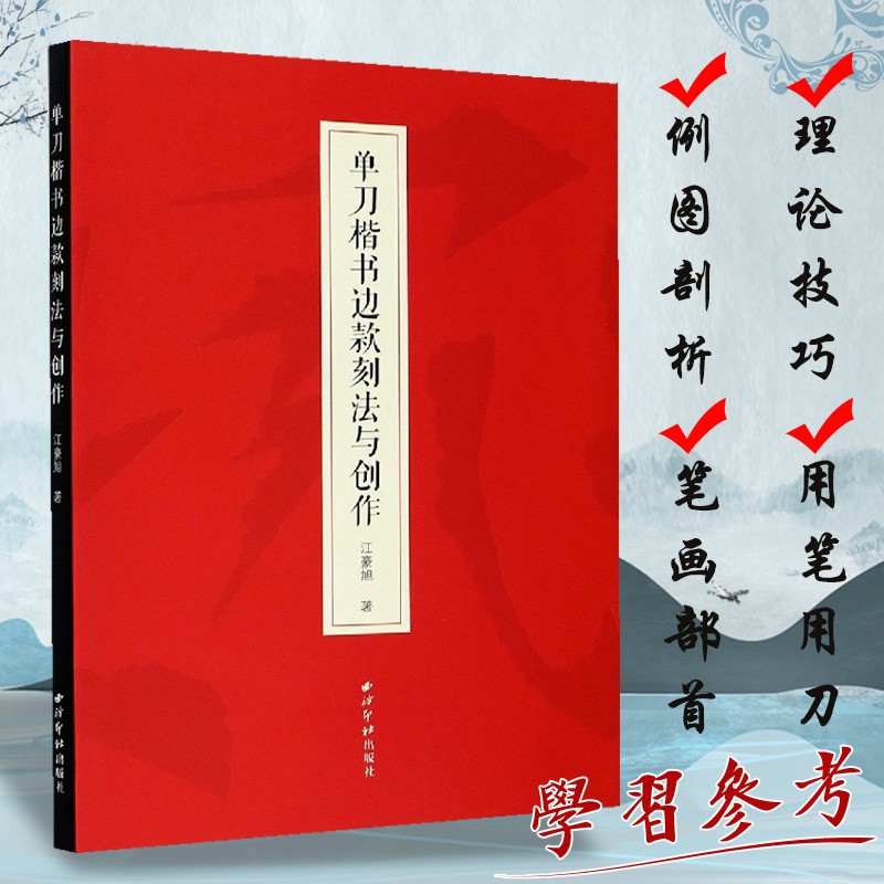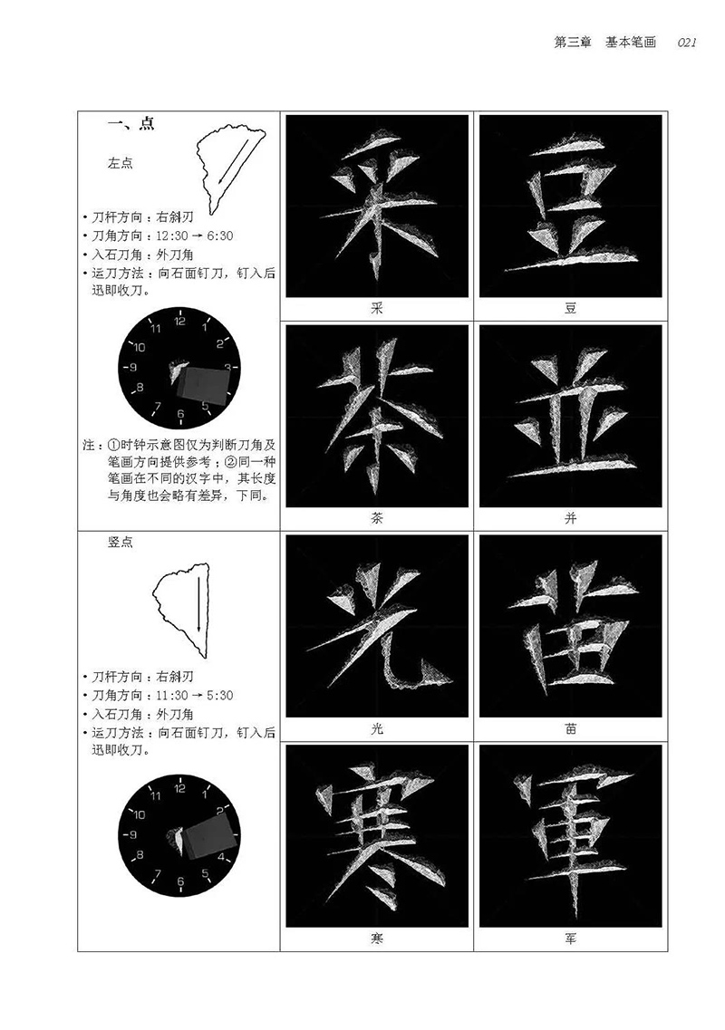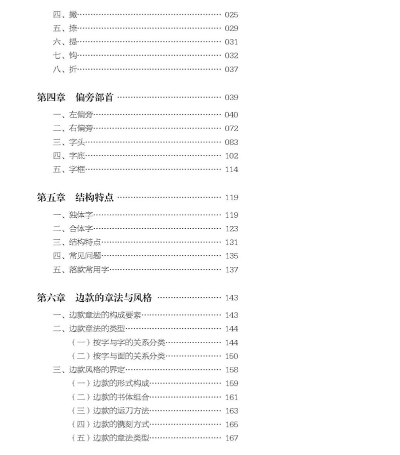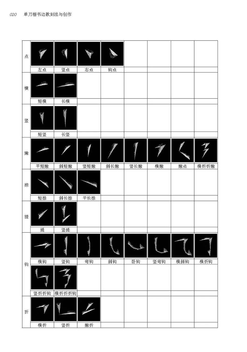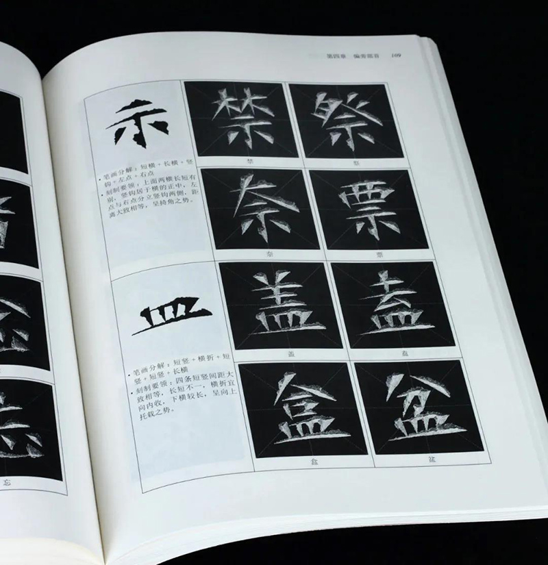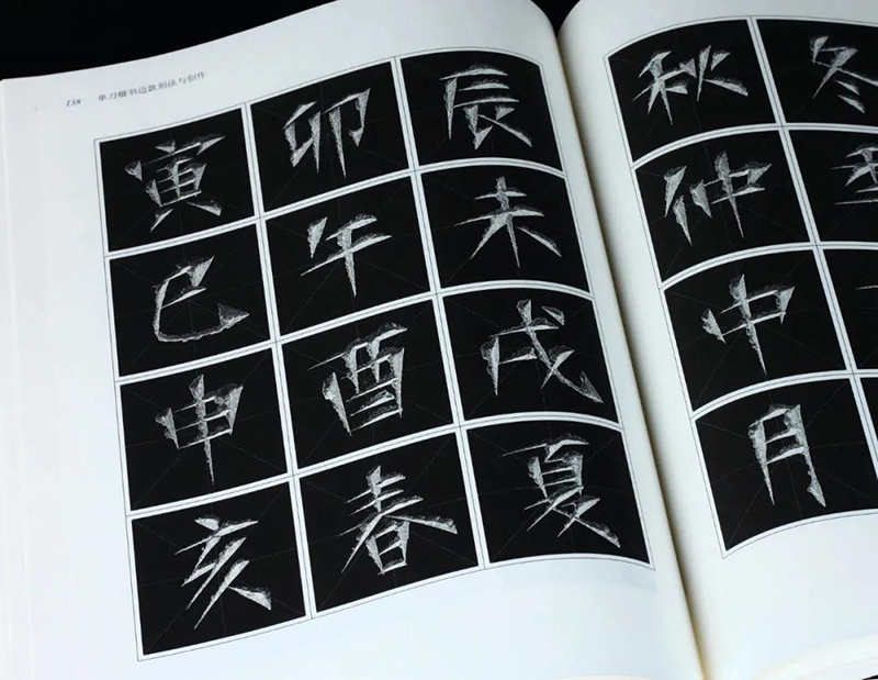 《單刀楷書邊款刻法與創作》全書236頁,共九章,前五章主要講解邊款刻法,從邊款起源到用刀方法,從基本筆劃到結構特點,循序漸進,沒有冗長的理論,只有真刀真槍的技法講解,800餘個範字全部由江豪旭(庵角山人)老師親自刻製,再經過高清掃描及專業處理,最終以米字格的圖片形式呈現,每一個範字的字口都十分清晰。