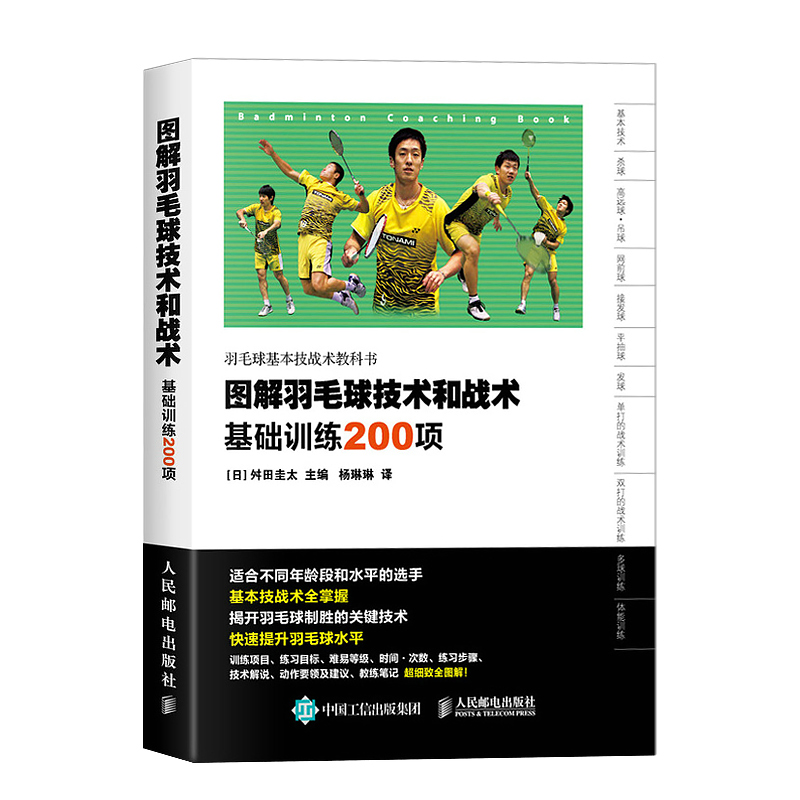 舛田圭太主編的《圖解羽毛球技術和戰術(基礎訓練200項)》是羽毛球基本技術和戰術的訓練攻略,全書包括針對羽毛球基本技術、殺球、高遠球·吊球、網前球、接發球、平抽球、發球、單打的戰術訓練、雙打的戰術訓練、多球訓練、體能訓練等200項基礎訓練項目,以及羽毛球訓練計劃的製訂方法;每項訓練又涵蓋目標、等級、練習步驟、教練筆記、動作要領及建議等內容,並以真人實拍照片、示意圖形式細緻講解每項訓練內容和訓練方法。本書適合從小學生到國家隊選手的所有羽毛球運動員和愛好者夯實羽毛球基本功,並有效提高他們的羽毛球技戰術水平。