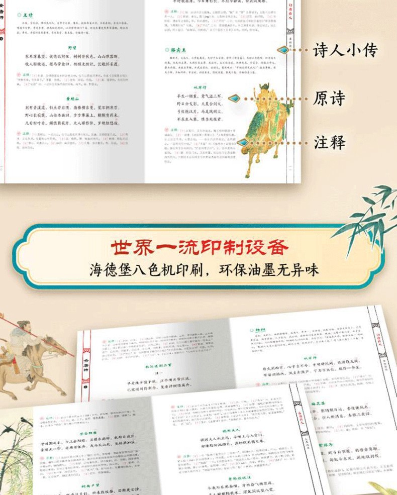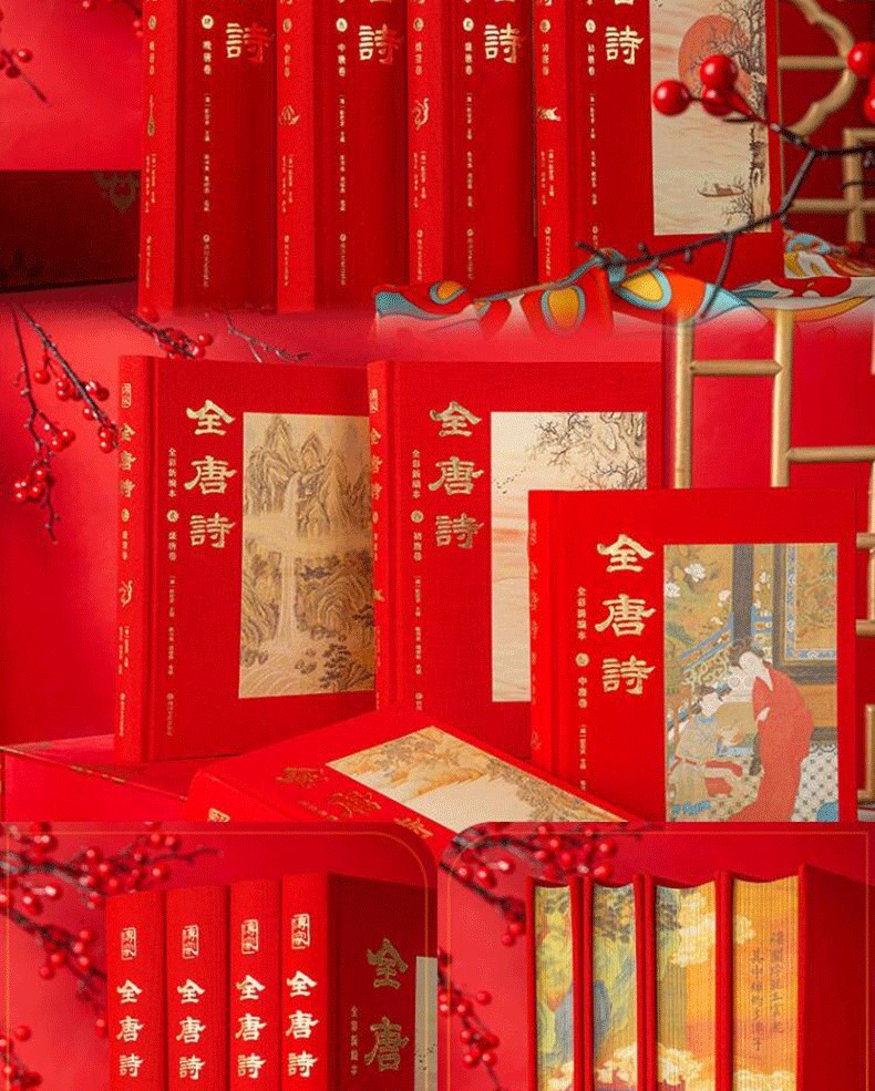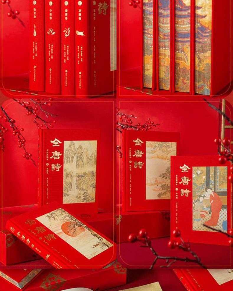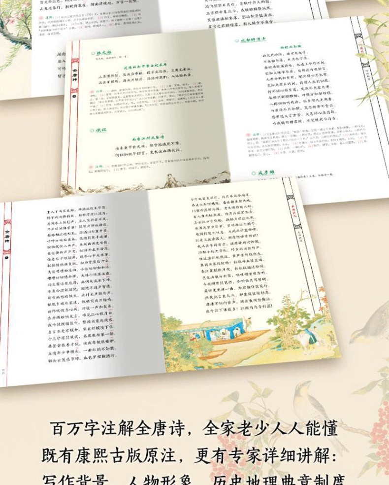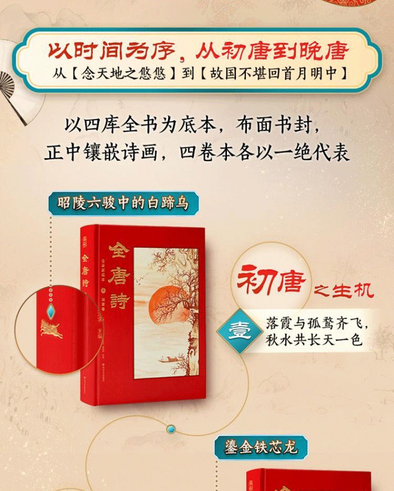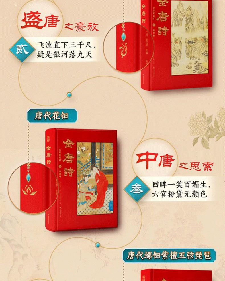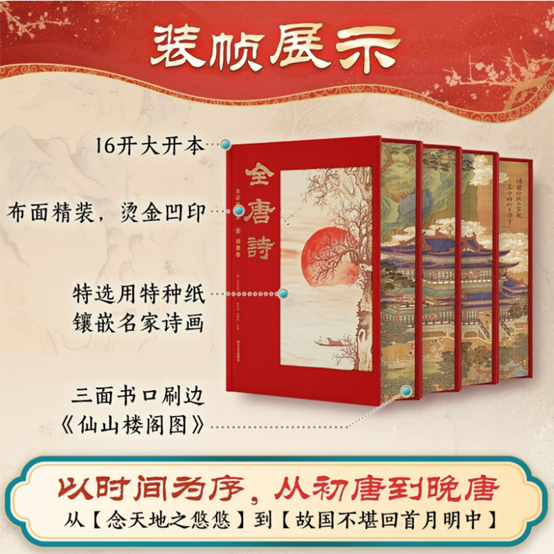 《全唐詩》全彩版,共四冊,初唐、盛唐、中唐、晚唐各一本。以道揚州詩局本及四庫全書本《禦定全唐詩》為底本,囊括了全部詩人2429人,原則上保證所有詩人收錄。並依詩歌流派分為:山水田園詩派、邊塞詩派、宮廷詩派、改革派等,收錄詩人代表作,剔除誤收的、殘斷的詩作,最終精選2873首詩歌,輔以詩人小傳、註釋及全彩插圖。詩人以其所在時代為準,按首字母排序,方便讀者查詢。