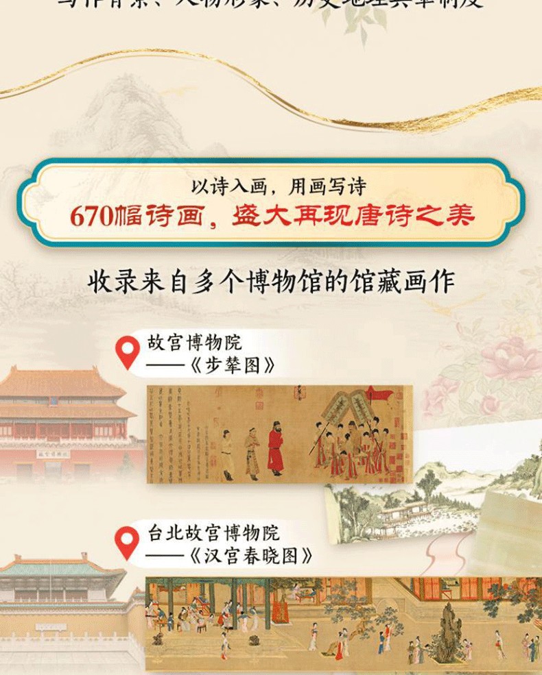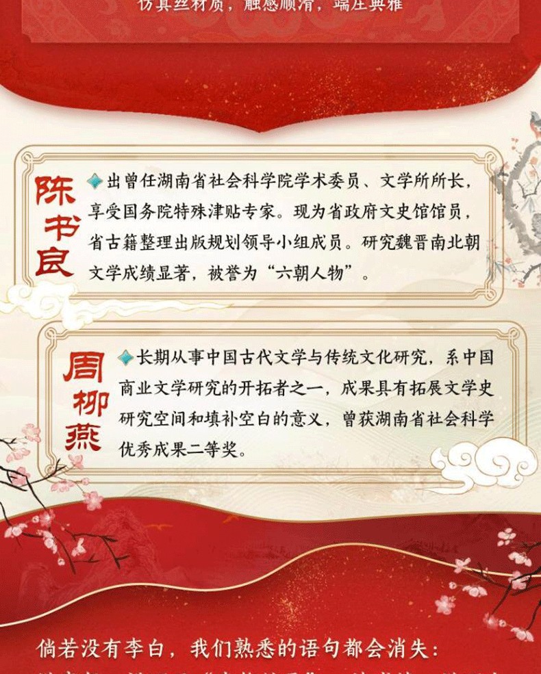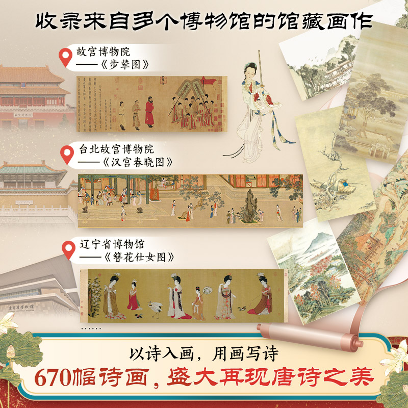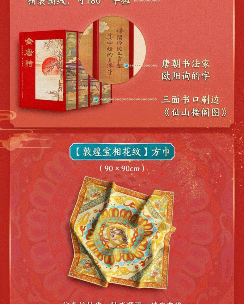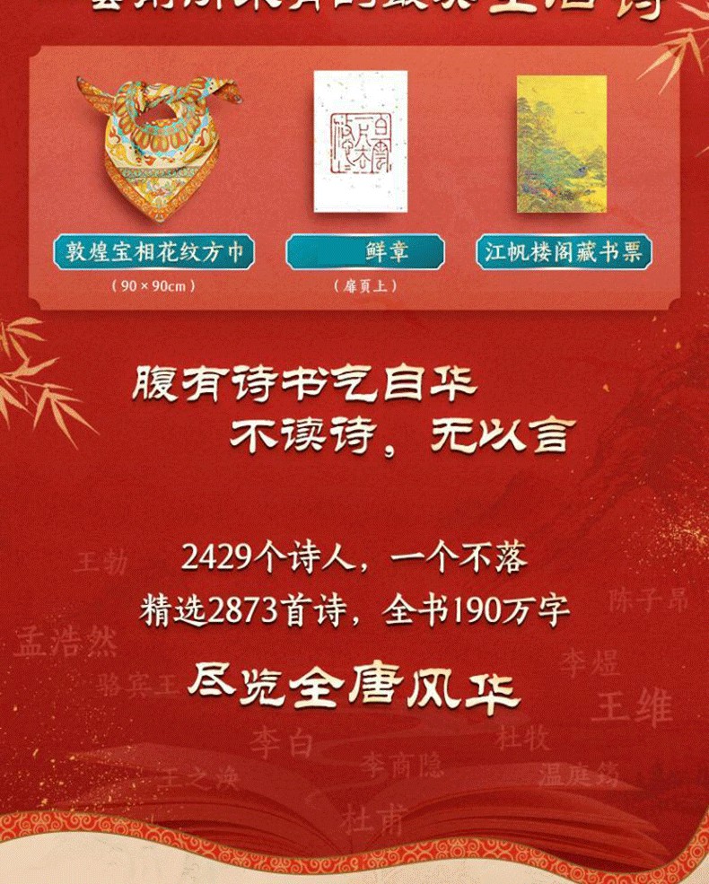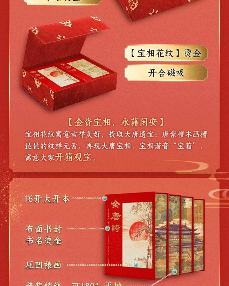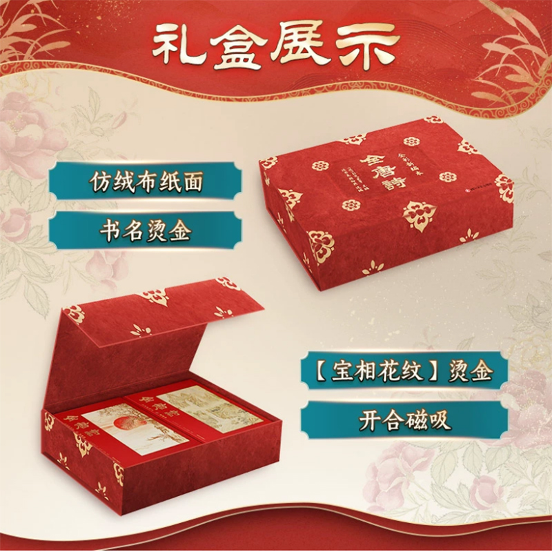 《全唐詩》全彩版,共四冊,初唐、盛唐、中唐、晚唐各一本。以道揚州詩局本及四庫全書本《禦定全唐詩》為底本,囊括了全部詩人2429人,原則上保證所有詩人收錄。並依詩歌流派分為:山水田園詩派、邊塞詩派、宮廷詩派、改革派等,收錄詩人代表作,剔除誤收的、殘斷的詩作,最終精選2873首詩歌,輔以詩人小傳、註釋及全彩插圖。詩人以其所在時代為準,按首字母排序,方便讀者查詢。