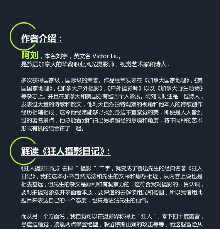 《狂人攝影日記》第2版側重自然風光攝影實戰講解,從器材、構圖、用光、對焦及後期處理等幾個環節逐一對讀者可能碰到的各種拍攝環境進行深入淺出的分析,幫助讀者一步步拍出令人驚豔的自然風光佳作。 《狂人攝影日記》既是一本可以從頭到尾讀完的攝影教學書籍,又是一本的隨身攜帶工具書,針對不同拍攝環境,相應章節都有解決方案。隨書光盤中包含了書中部分作品的後期處理視頻教程。
