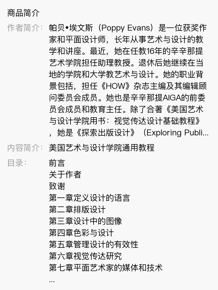 《美國藝術與設計學院通用教程:視覺傳達設計基礎(國際版第3版)》已經完全更新,反映新的平面設計理念和展示當代的設計作品。用直截了當的方法和動態的案例,明確解釋了基本的設計原則,以屢獲殊榮的專業設計作品為實例,並以圖表的形式清晰展示這些設計原則如何被運用於成功的設計方案中。介紹實用的、可視化的世界平面設計,為讀者詳細講述了設計概念的方方面面,內容包括顏色、圖像、創意思維、視覺問題的解決、平面設計領域的概述和相關的職業選擇。此外,第三版更新了數字媒體、交互設計和排版印刷的內容,確保讀者在不斷變化的平面設計世界中學到所有需要的新信息。