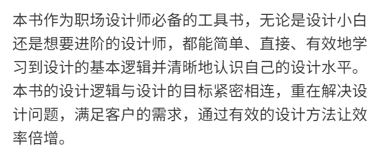 本書作為職場設計師必備的工具書,無論是設計小白還是想要進階的設計師,都能簡單、直接、有效地學習到設計的基本邏輯並清晰地認識自己的設計水平。本書的設計邏輯與設計的目標緊密相連,重在解決設計問題,滿足客戶的需求,通過有效的設計方法讓效率倍增。