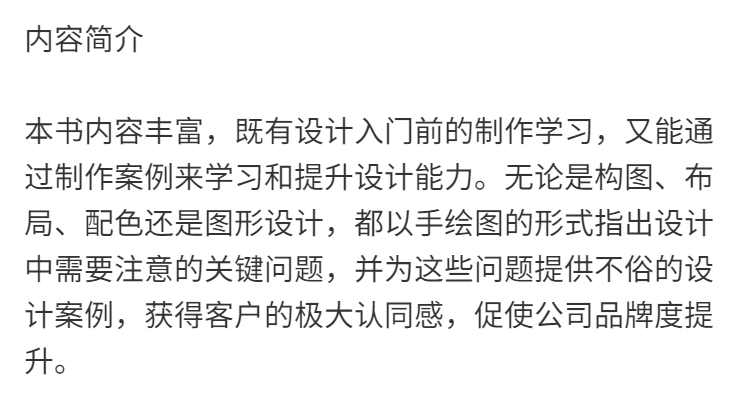 本書內容豐富,既有設計入門前的製作學習,又能通過製作案例來學習和提升設計能力。無論是構圖、佈局、配色還是圖形設計,都以手繪圖的形式指出設計中需要注意的關鍵問題,並為這些問題提供不俗的設計案例,獲得客戶的極大認同感,促使公司品牌度提升。