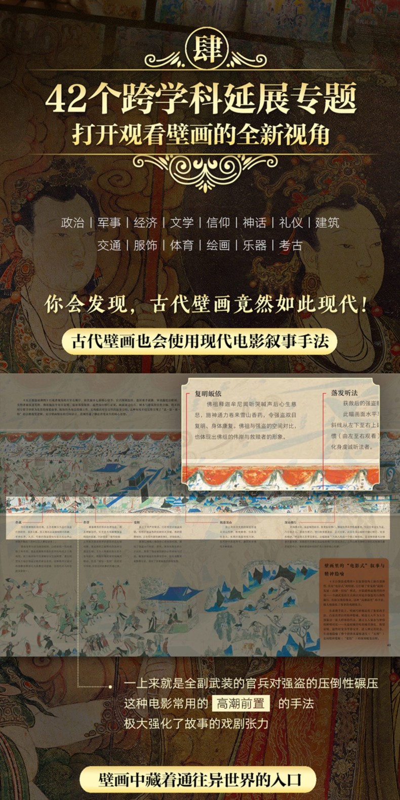 4. 42個跨學科延展專題,打開觀看壁畫的全新視角:全書穿插42個跨學科專題,涉及古代古代政治、軍事、經濟、文學、信仰、神話、禮儀、建築、電影等領域,使我們發現壁畫不是簡單地照搬現實,而是真實歷史場景結合現代壁畫電影創作手法、古人豐沛像力的認知藝術,以更新讀者畫