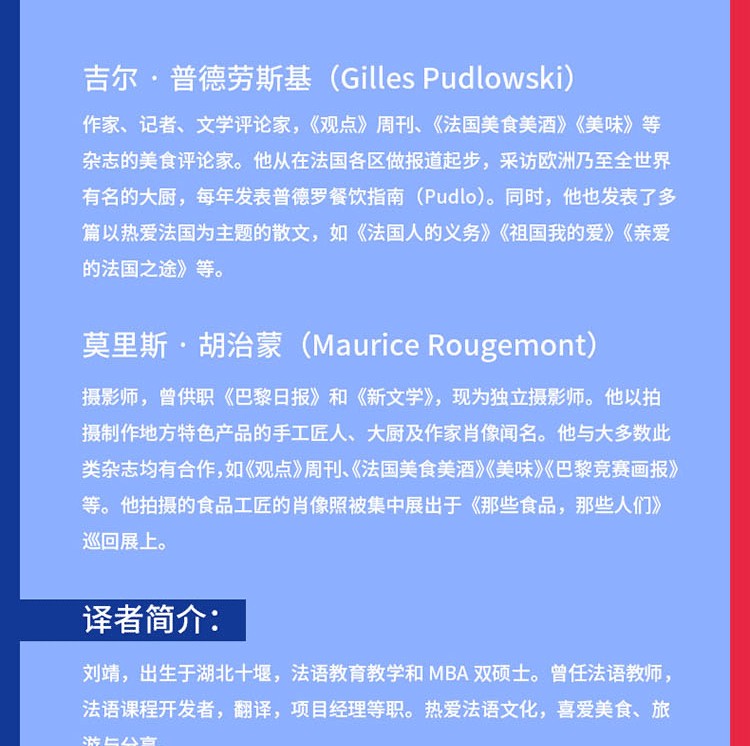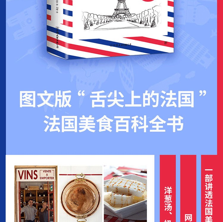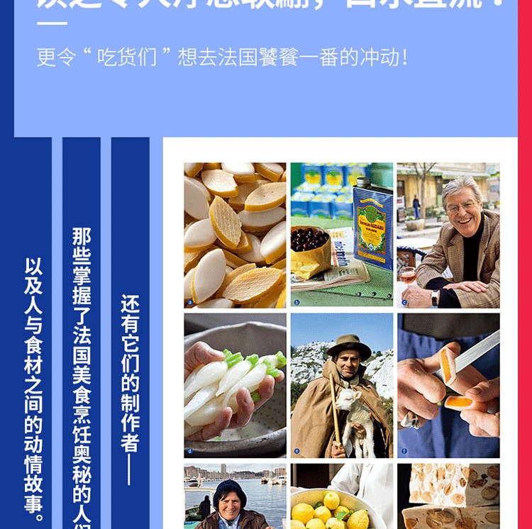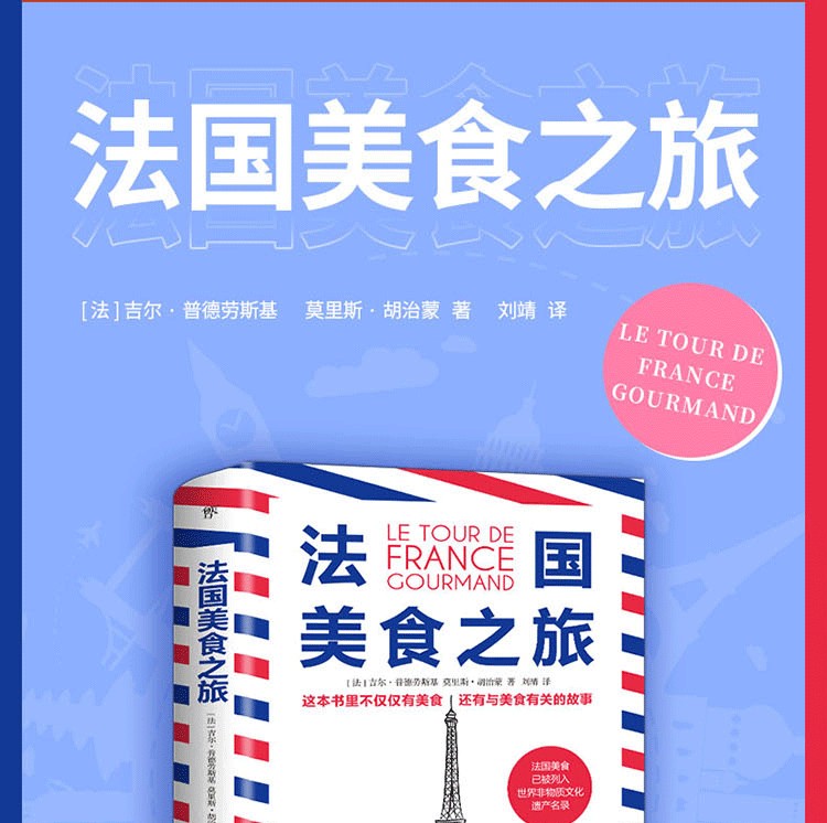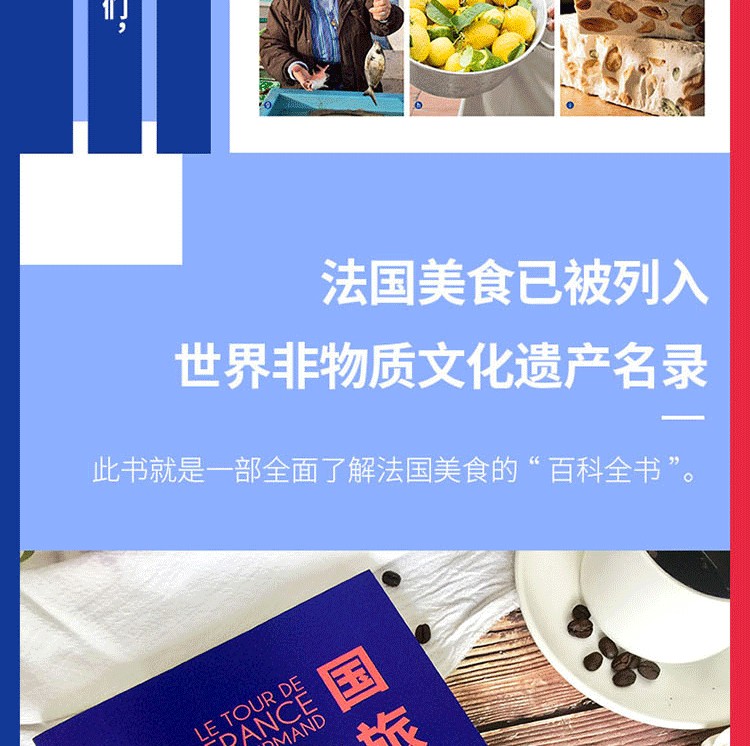 《法國美食之旅》是全法著名的美食作者三十年努力的成果,足跡按順時針方向沿著法國的輪廓,從北部到東部,再到南部、西部,然後再回到巴黎,途經全法美食聚集之所。介紹法國上佳名廚、美食和充滿天賦的美食工匠。從世界聞名的香檳到寂寂無名的“醃鯔魚籽”,從傳統美食肥鵝肝到另類美食“蜜汁”,本書匯聚所有葡萄酒和菜餚,大廚和工匠,讓讀者感受高品質的法國美食。它將帶你走上色彩繽紛的美麗旅程,向你展示超棒的法國特色美食,以及它們的製作者。法國美食已被列入世界非物質文化遺產名錄。