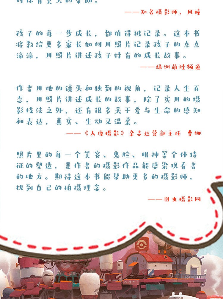 這本書會從*貼近生活的角度出發,用*通俗易懂的文字去敘述,你需要的只是一台可以拍照的設備。無須複雜的佈光,也不必去記憶和理解什麼理論,因為拍攝方法會直接呈現在畫面中。我想告訴你的是,即使你不能熟練地使用相機,你依然可以很好地記錄孩子的生活。