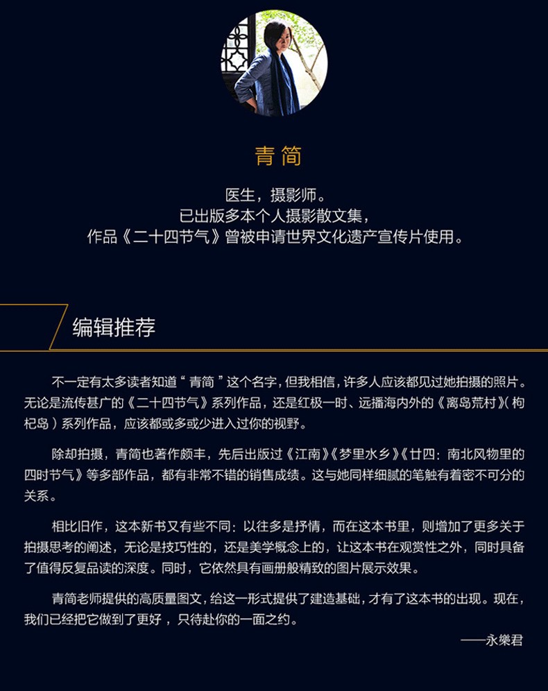 本書以攝影家李少白的攝影觀為基礎,從創作理念、觀察、構圖、光影、色彩、意境、樂趣等諸多方面入手,進行攝影講解,並創造性地加入了導師與學生的作品交流,豐富的案例解析使得知識點講解更為具體、深刻。李少白經驗頗深,他卸下了強加在攝影身上的各種“哲理”“意義”“價值”等沉重的枷鎖,把攝影還原為一種感受美、表達美的簡單愉悅的手藝。本書在把握李老師創作底層思維的基礎上,融會貫通文史哲等博雅知識,希望激發讀者對藝術和美學的興趣,使其擁有更加開放的心態和對世界的好奇,以保持創作的活力和更上層樓的可能。