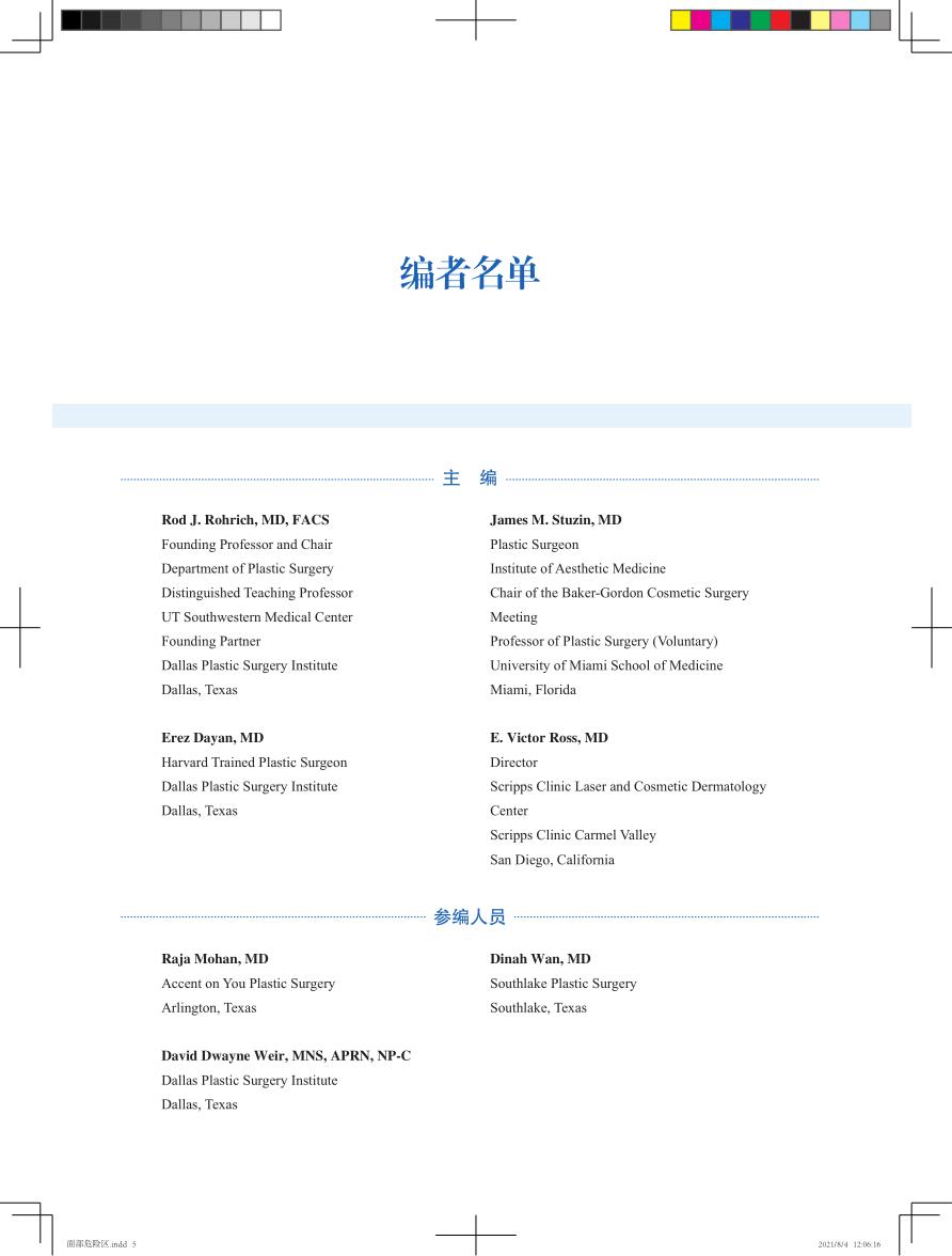 本書兼具先進性、科學性,操作性強,是一本難得的優秀工具本。用言簡意賅的文字,配上清晰的局部解剖照片、精美的藝術細節插圖及解剖短視頻,幫助讀者更易理解、記憶和掌握相應的解剖結構和層次。本書對於美容外科醫生,在美容外科手術操作中,別是在面頸部除皺術中,可自信從容地避免面部運動神經及重要血管的損傷,提升手術的預期效果 ;對於專注於面部微整形和注射填充的醫生,可以更有效地避免嚴重並發症的發生,包括失明和皮膚壞死等 ;對於光電皮膚醫學醫生,可在頸部操作上實現安全性的