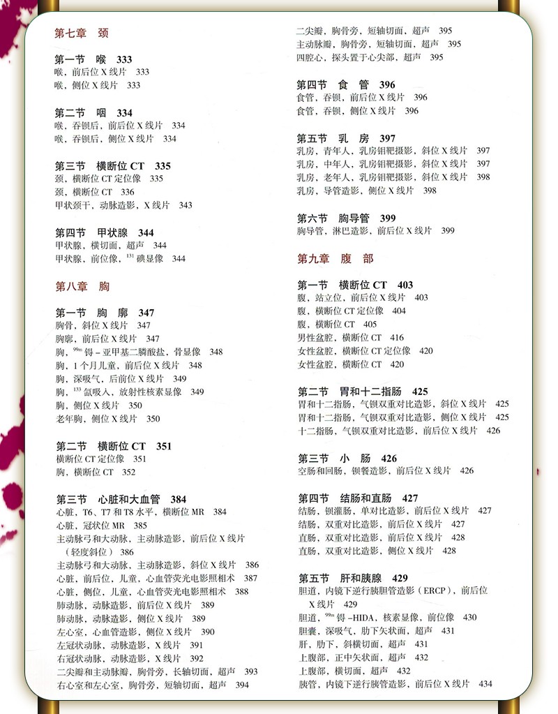 本書共10章,第1章簡要介紹解剖平面、標誌、術語、分區、多平面重組和3D成像;第2-10章重點介紹腦顱、面顱,腦,脊髓,頸,胸腔,腹部,盆部,上肢,下肢各個部分每個解剖斷面的CT、MRI、3D圖像、血管圖像,以及對應的解剖圖和線條圖,同時對於常見解剖結構配有必要的文字描述,幫助大家在學習CT和MRI過程中更輕鬆、快速的掌握閱片基礎。