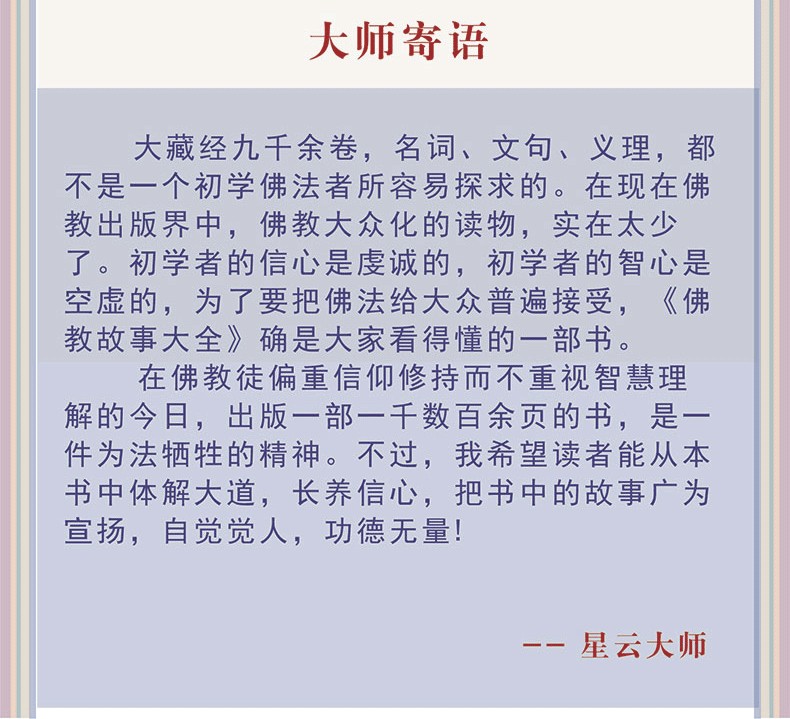 《佛教故事大全》是全面佛教故事的結集,收錄近五百篇佛教故事,台灣佛光山5位佛子傾心編撰。