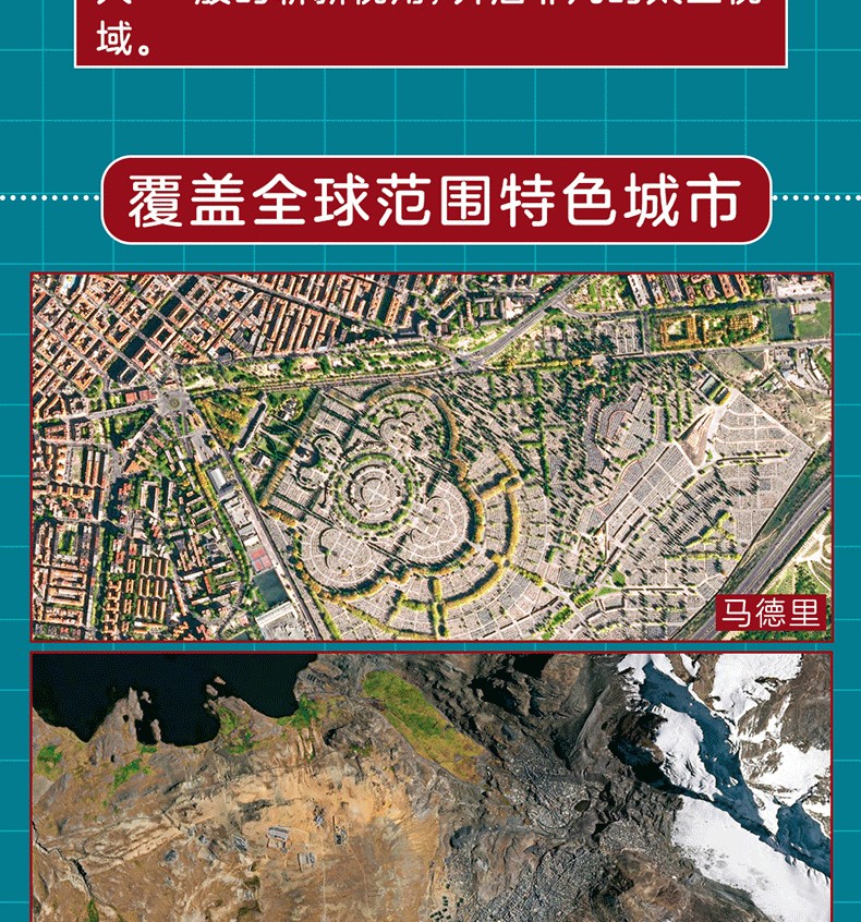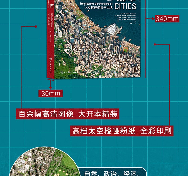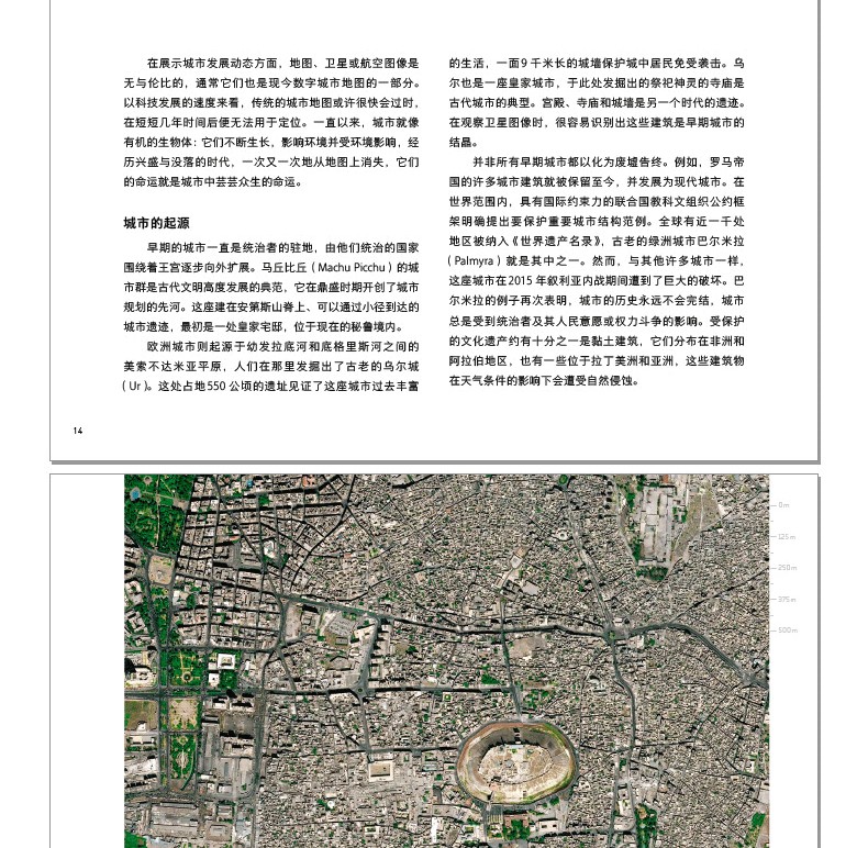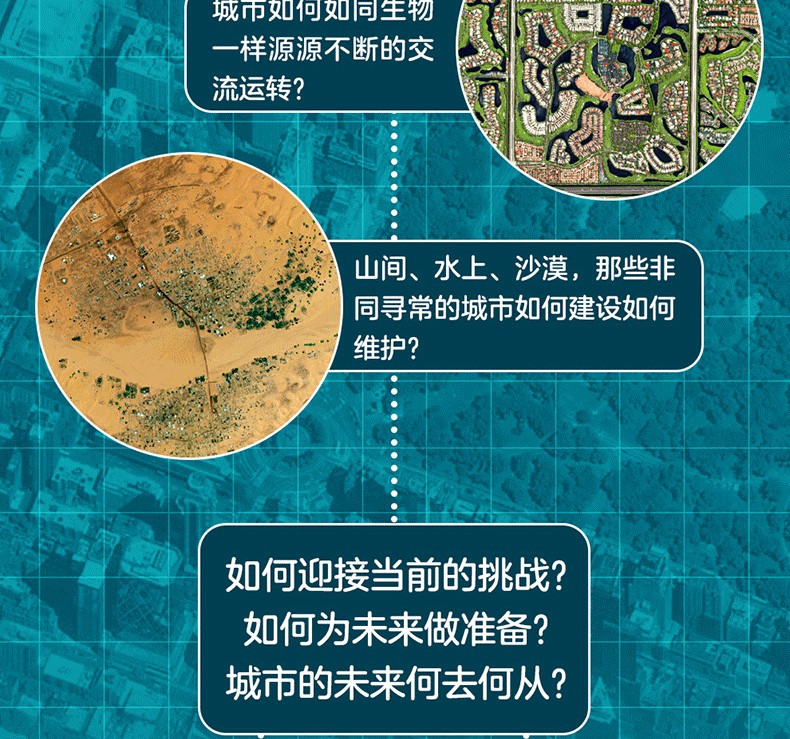本書收錄了百餘幅高清衛星攝影圖像,展示了世界不同類型城市的規模、結構的多樣性,並用言辭優美的文字簡要介紹了當地自然條件、城市特徵及風土人情。從距離地球400千米到900千米的高空俯瞰地球,無論是流光溢彩的國際大都市倫敦、巴黎,還是人跡罕到的安第斯山脈中的“金城”,抑或是空無一人的“鬼城”普里皮亞季,城市的豐富色彩無時無刻不在衝擊著人們的視域,在人類中留下墨重彩的一筆文明。