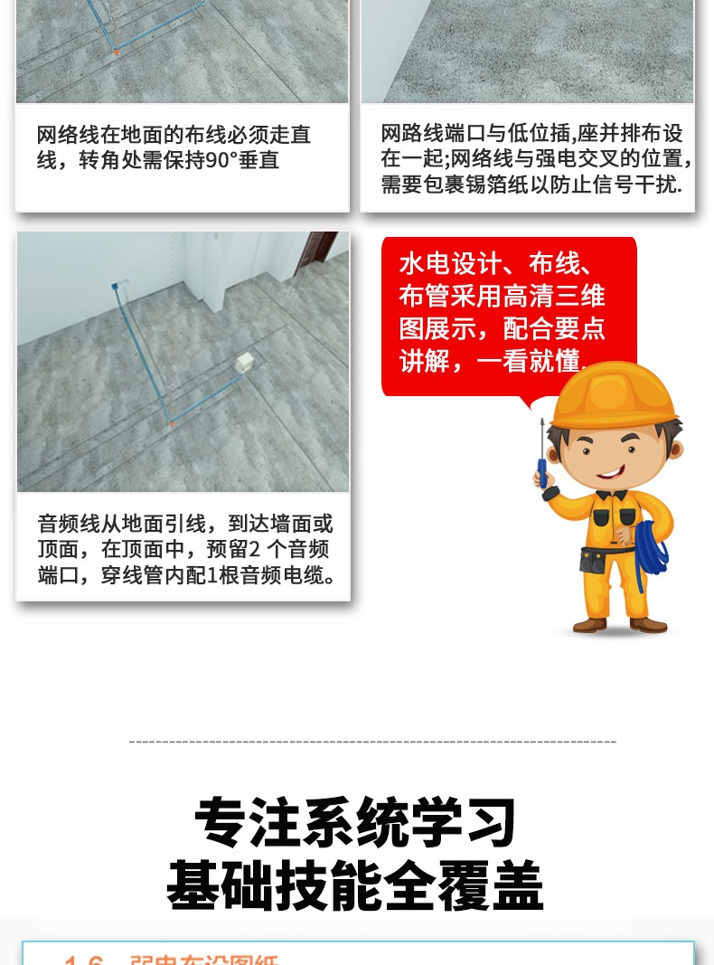 2.三維圖講設計佈置。水電設計、佈線、布管採用高清三維圖進行展示,配合要點講解,一看就懂。