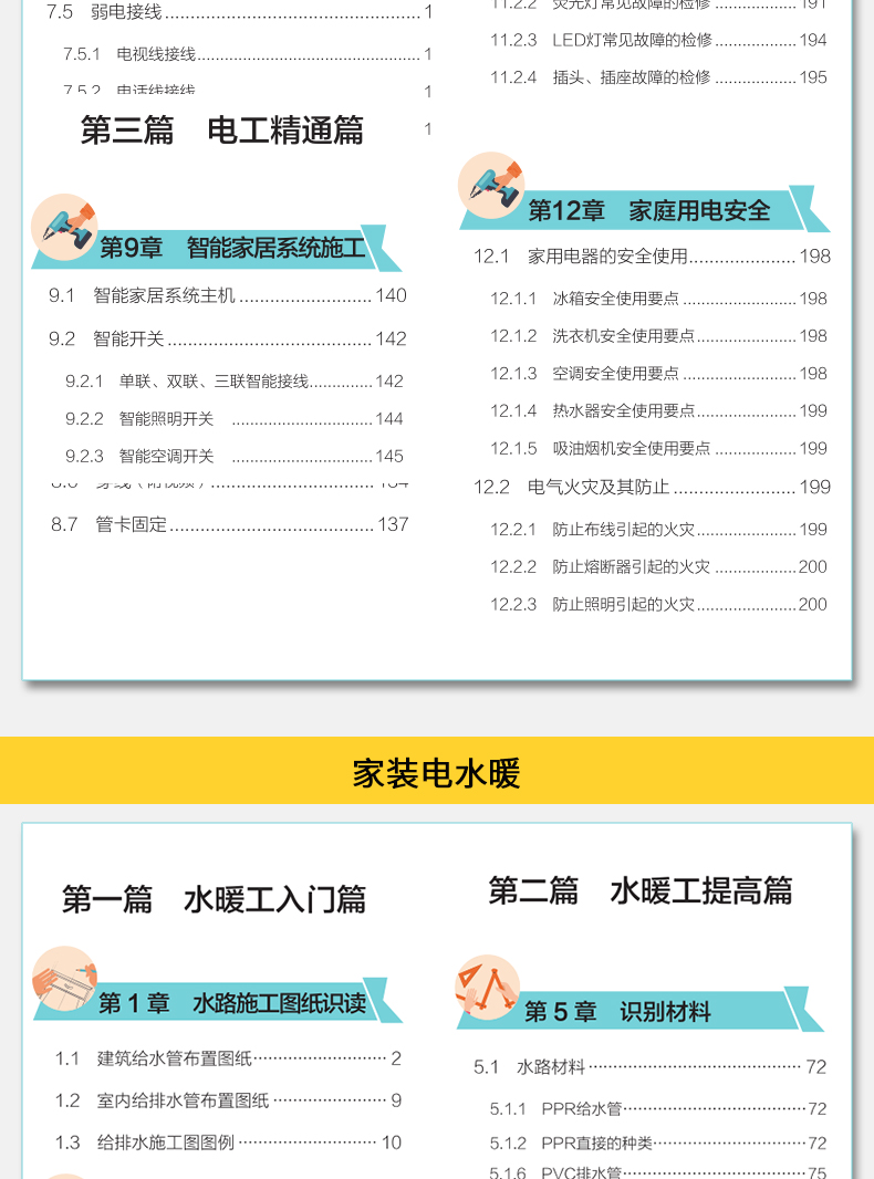 本書分為電工部分和水暖工部分,包含六篇、二十四章內容。電工部分主要介紹裝修電工施工。第一篇為電工入門篇,內容包括電路施工圖紙識讀、電路端口空間佈設、電路工具以及電路施工預算等;第二篇為電工提高篇,這部分為核心內容,包括識別管線、電路佈線與配線、電路接線以及現場施工等內容;第三篇為電工精通篇,內容包括智能家居系統施工、用電設備安裝、電路修繕以及家庭用電安全等。