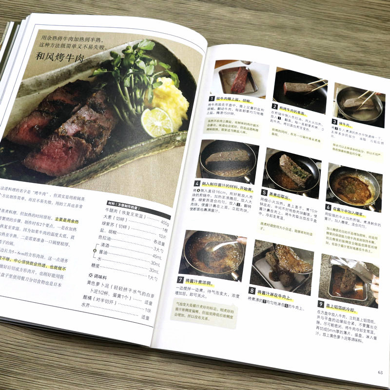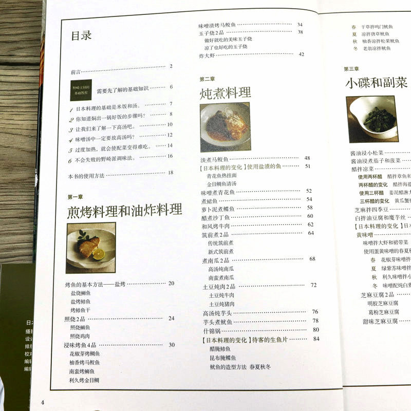 本書分為煎烤、燉煮、小碟與副菜與米飯和湯4個章節,介紹了日式料理中具有代表性的73款料理,用一步一圖的視頻教學模式詳細講解製作方法,包含我們熟知的日本料理,如照燒、烤魚、玉子燒、築前煮、壽司飯、日式涼拌菜等。作者在本書內容設計上非常用心,從日本料理基本的高湯製作和用法、燜米飯的方法、日式料理調味的基本原則開始講起,使初學者也能很快抓住日本料理的精髓,每款料理都有其來歷、特色、關鍵步驟的詳細講解和多年經驗分享,內容豐富實用,是想要學習日料和精進技術的讀者可遇不可求的指導書籍。