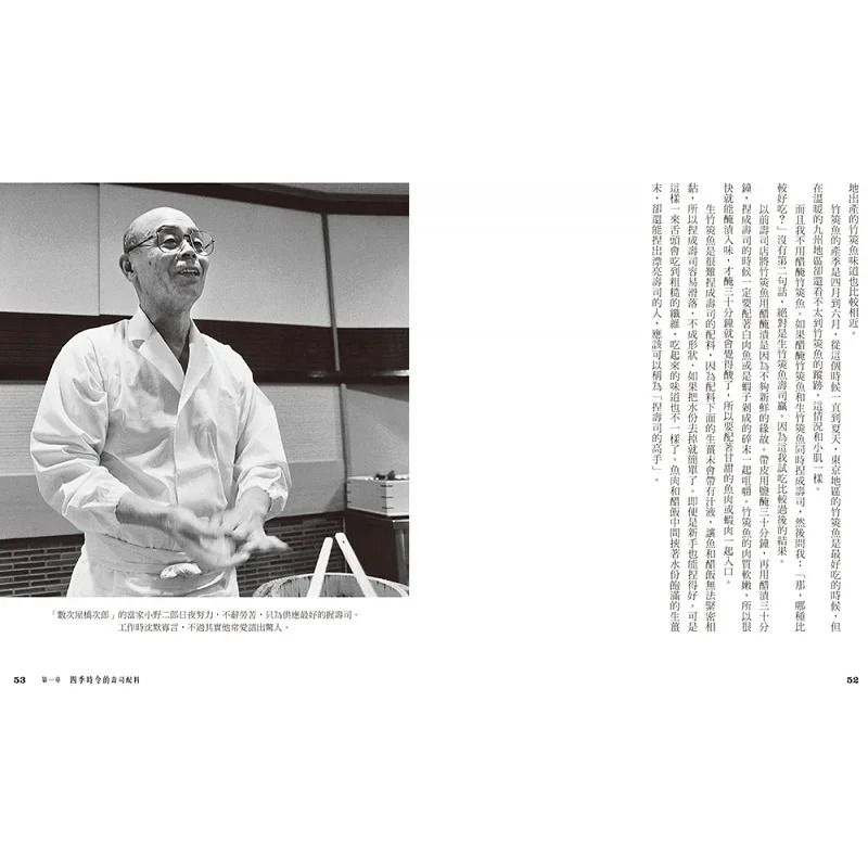 ■內附詳細米其林三星主廚小野二郎的「壽司」食譜,集結「數寄屋橋次郎」主廚小野二郎的料理生涯大成,可學習壽司技巧,更見習大師精神和素養,因為他不僅俱備一流廚師必要的非凡「嗅覺」、「味覺」以及「味蕾記憶」,更有超乎常人的「執著」、「要求最美」以及「堅持」。