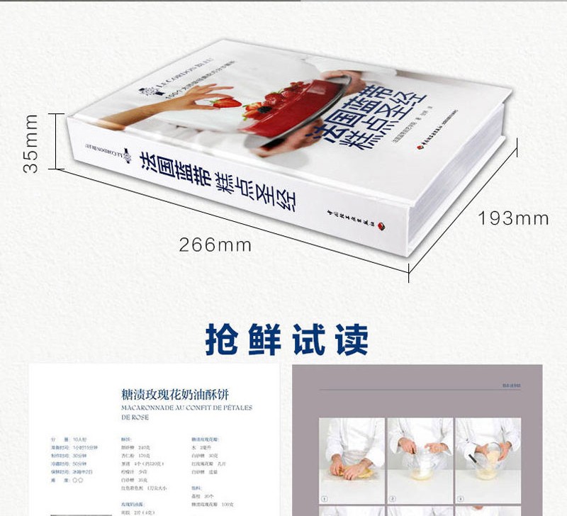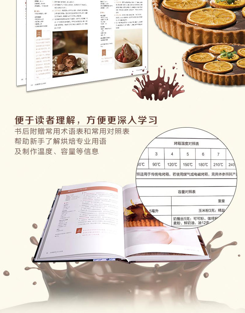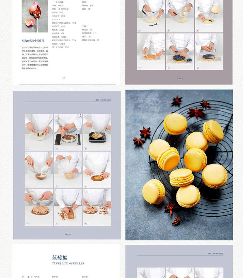 書中甜品突出法國藍帶廚藝學院特有的精緻裝飾和出眾技藝,單獨列出的參考部分則涵蓋製作麵糊、蛋白霜、沙司,以及加工水果、巧克力調溫、蛋糕裱花等所有基本技法。