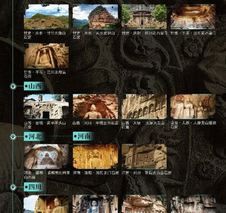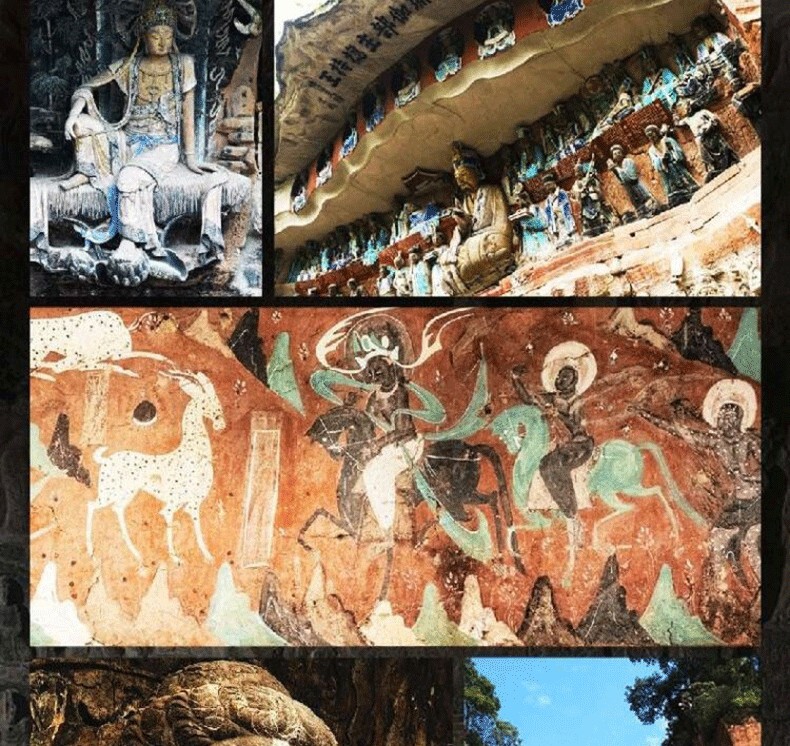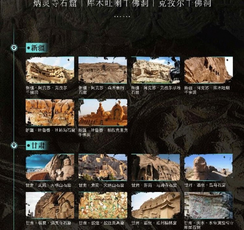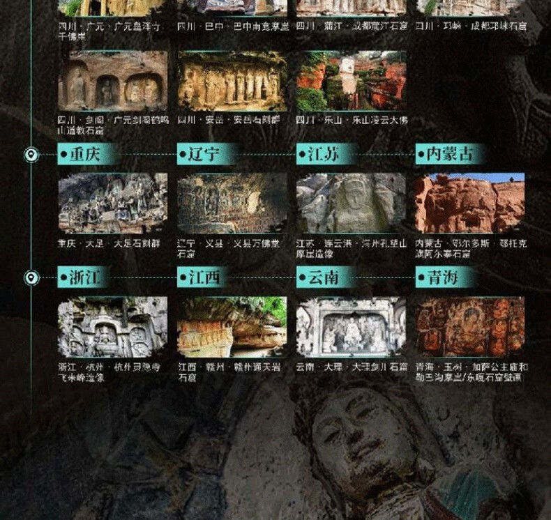 《中國石窟全書》,書中主要描述了中國石窟藝術的發展史,並舉例介紹極具民族特色的中國石窟藝術。書中以石窟藝術作為載體,詳細描繪了中國石窟藝術的綿亙千年歷史,此外,還囊括了富麗多彩的石窟壁畫,含佛經故事、山川景物、亭台樓閣等建築畫、山水畫、花卉圖案、飛天佛像以及當時勞動人民進行生產的各種場面等,是十六國至清代1600多年的民俗風貌和歷史變遷的藝術再現,雄偉瑰麗。