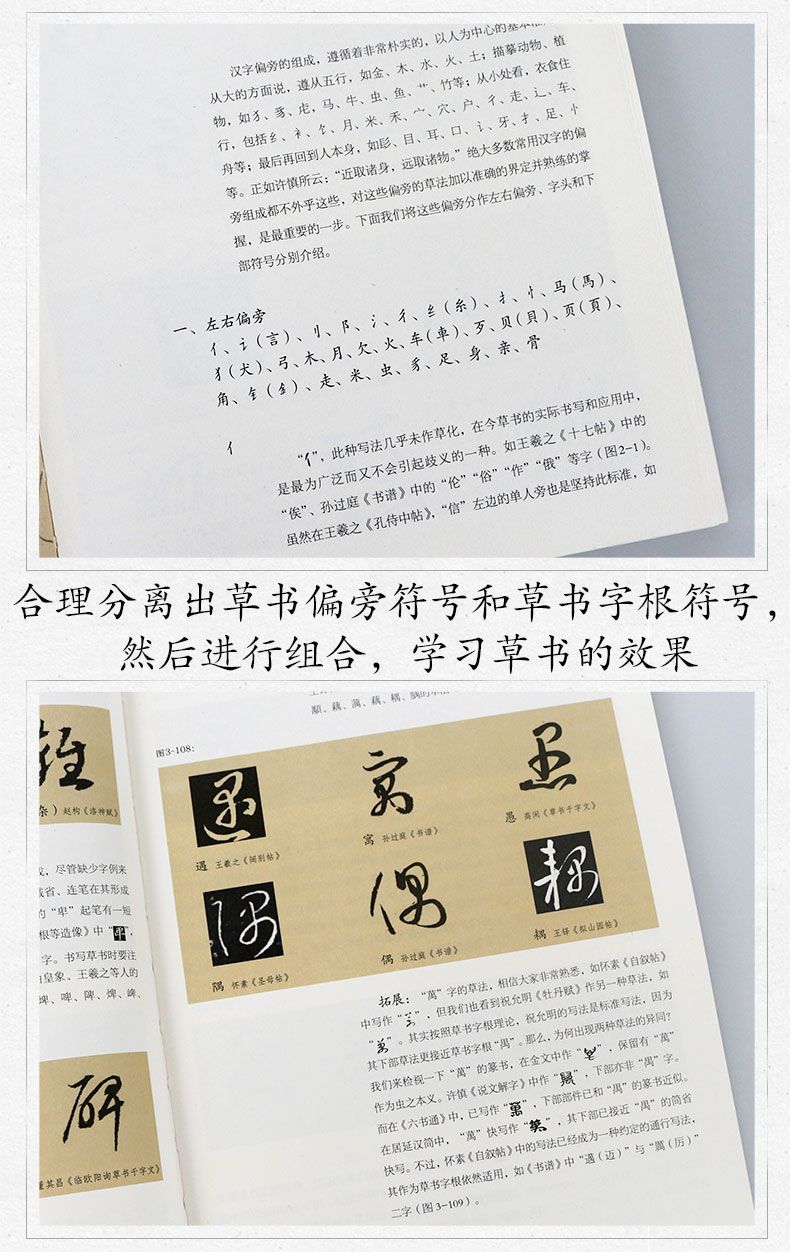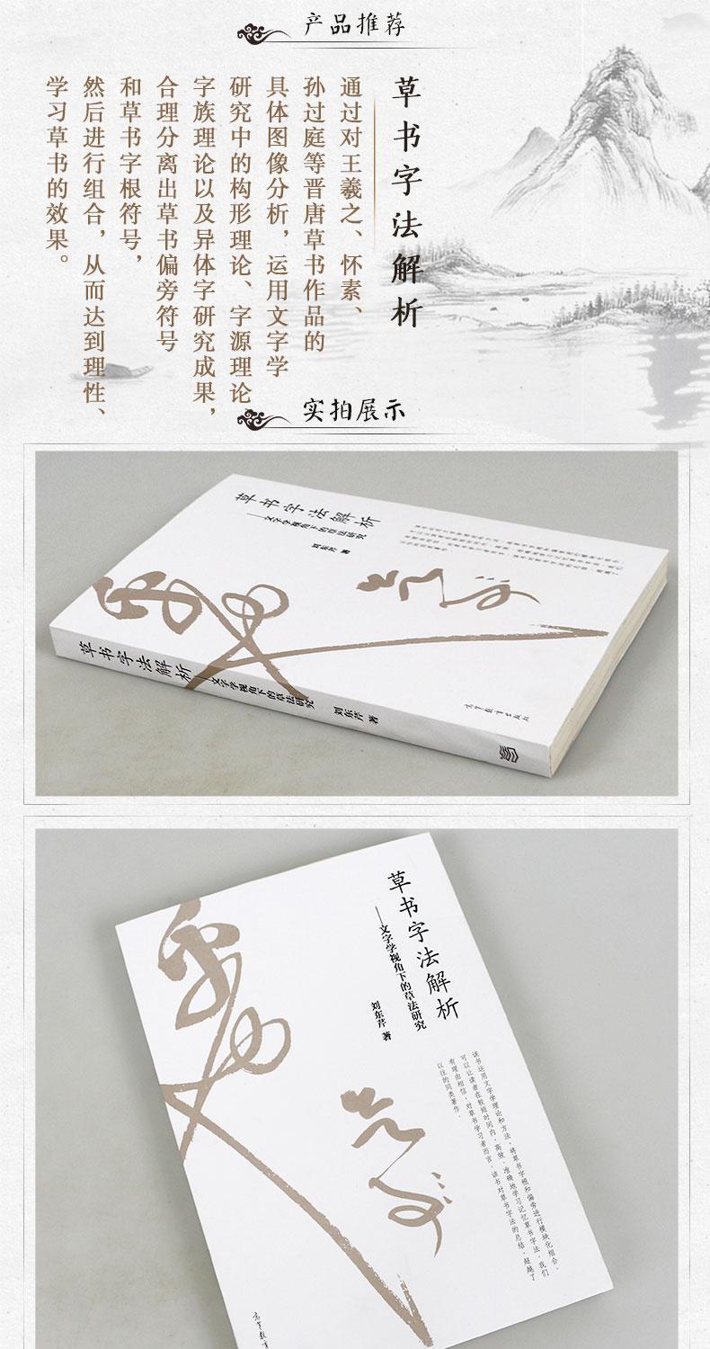 《草書字法解析——文字學視角下的草法研究》是對草書字法的專題研究。通過對王羲之、懷素、孫過庭等晉唐草書作品的具體圖像分析,運用文字學研究中的構形理論、字源理論、字族理論以及異體字研究成果,合理分離出草書偏旁符號和草書字根符號,然後進行有機組合,從而達到理性、高效地學習草書的效果。讀者通過對本書的閱讀,可以拋棄過去死記硬背的草法學習路徑,迅速進入理解式、循環式記憶,能在短期內掌握大量正確的草書字法。同時,該書對歷代草書經典的欣賞、考釋以及當代的草書創作都具有一定的借鑒意義。