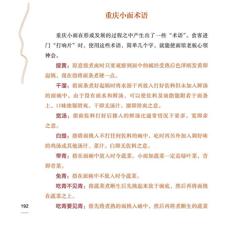 移民使麵條成為重慶人的主食。本書詳細介紹了目前能夠吃到的重慶小面所有品種(包括35種臊子麵及17種特色面)的製作技術和文化歷史背景,著重介紹了重慶小面使用的調料種類及其加工技術、鮮湯的吊制技術、油脂的熬製技術等最影響風味的幾個方面,書中還收集和整理了歷史上各個時期與重慶小面有關的知識,同時收集了部分食客對重慶小面這張“城市名片”的評價文章。