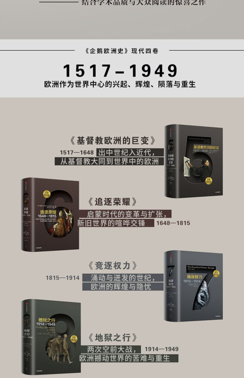 “企鵝歐洲史”九卷,集歐洲史各領域權威學者之力,有如閃耀不同光澤的寶石。 1517-1949年,是歐洲以空前創造力、破壞力撼動全球的四百年,也是我們所生活的現代世界成形的四百年,四位學者以各自特有的風格謀篇佈局,用三千多頁篇幅共同呈現有細部、有全景的恢宏長圖。