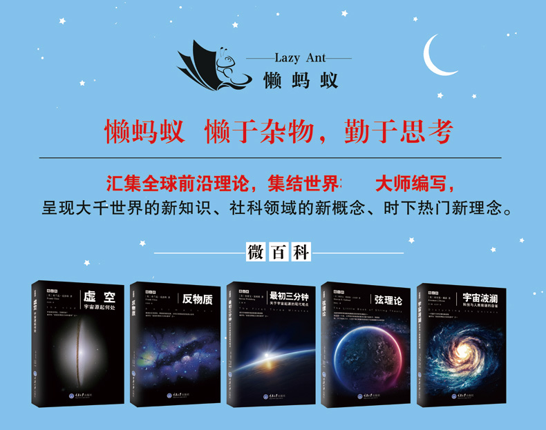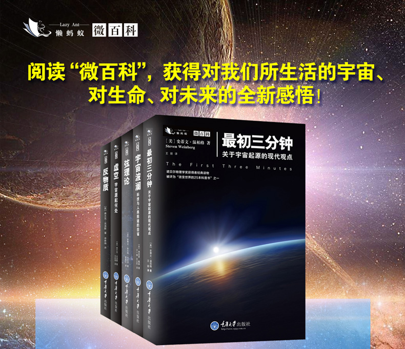 “微百科”系列叢書是由國外引進的一套自然科普讀物,目前包含五冊,各冊的作者是相關領域的諾貝爾獎獲獎科學家或知名科普專家,各冊書從大爆炸後的宇宙模型、時間與空間的存在狀態、反物質及弦理論解讀、科學家對科技發展與人類前途的探索與反思等國內讀者較為感興趣的幾個方面展現了當代宇宙學及物理學方面的一些重要發現、觀點和研究成果,對幫助讀者以*、可信的視角看待宇宙的奧秘與神奇以及人類的科學探索有極大幫助,是讀者們增長科學知識的不二選擇。