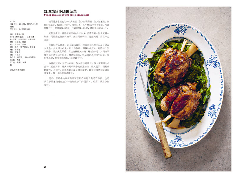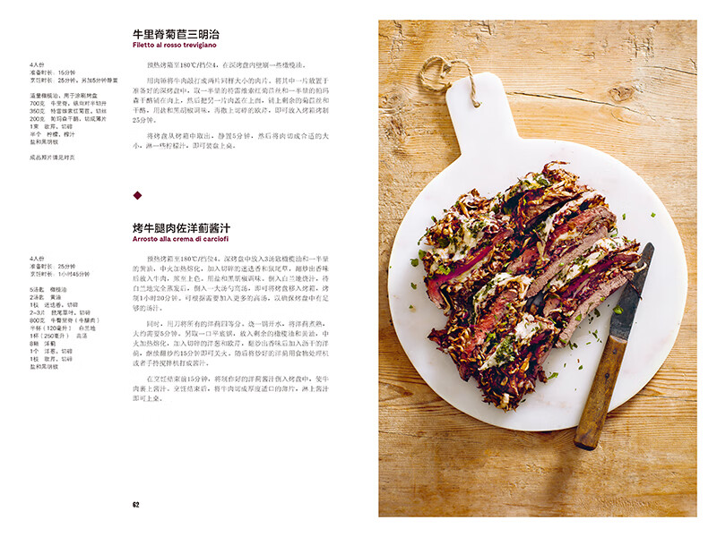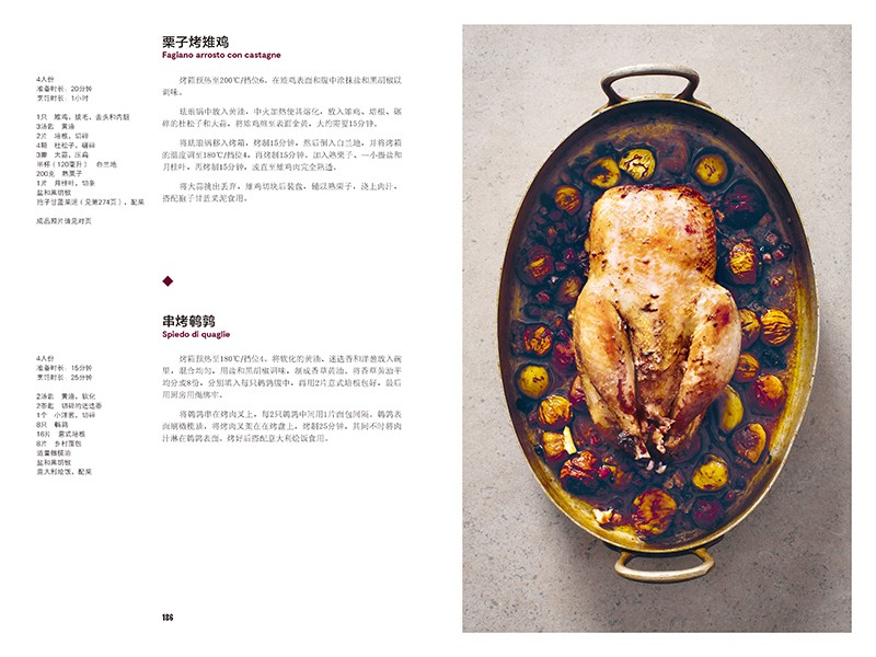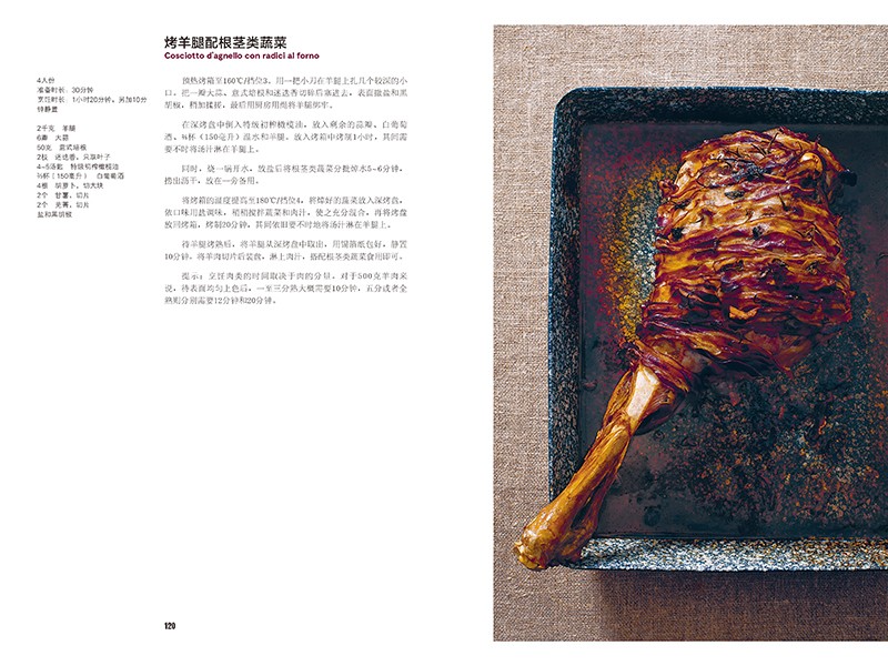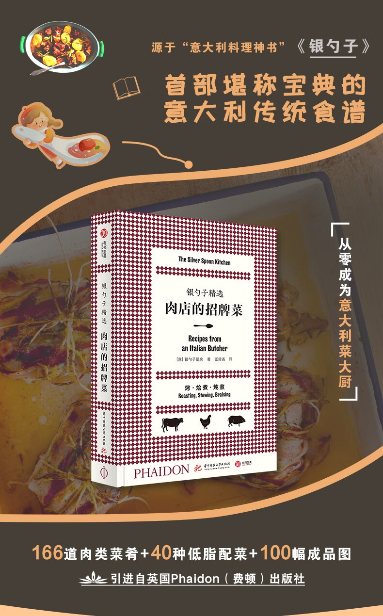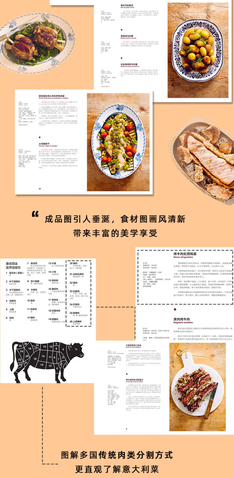 如今,這本義式烹飪寶典首初次登陸中國,《銀勺子精選——肉店的招牌菜》優選完全本獨具特色的166道肉類菜餚,從享譽全球的名菜“米蘭風味燴牛膝”“巴羅洛葡萄酒燉牛肉”,到近乎失傳的“獵人風味烤羊腿”“利古里亞風味炒雞”,搭配40種經典配菜,從烤、燴煮和燉煮三種主要烹飪手法入手,完整展現迷人且質樸的傳統意大利烹飪藝術。食譜包含豬肉、牛肉、小牛肉、羊肉、家禽及各類風味選擇,並根據肉類的不同特質,圖文並茂詳解意、美、英各國傳統分割方式,解鎖烹飪術語,是一本乾貨滿滿的家常意式料理入門食譜。