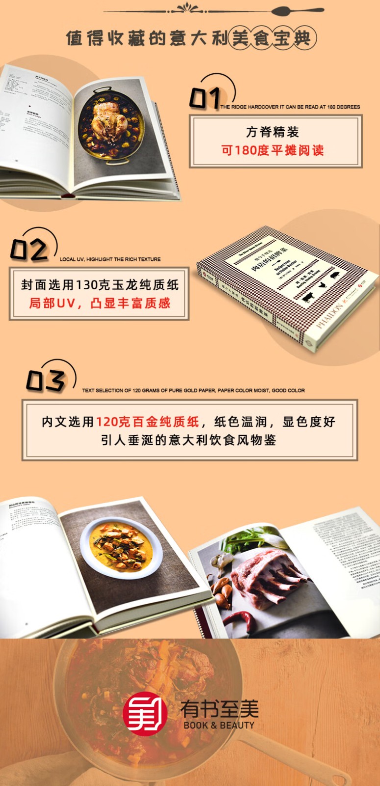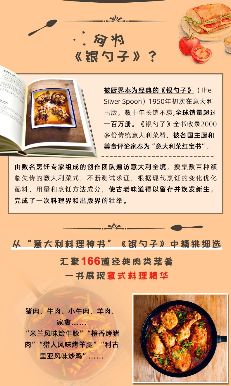 被廚界奉為經典的《銀湯匙》(The Silver Spoon)1950年初次在義大利出版,並立即成為經典,歷經數十年經久不衰,全球銷量超過一百萬冊。 《銀湯匙》全書收錄2,000多份傳統義大利菜餚,涵蓋義大利不同地區的經典菜餚,內容全面而生動,被各國主廚和美食評論家奉為「義大利菜紅寶書」。由數名烹飪專家組成的創作團隊遍訪意大利全境,蒐集到數百種瀕臨失傳的意大利菜式,並不斷測試和求證,根據現代烹飪的變化優化配料、用量和烹飪方法成分,編纂成首部堪稱寶典的意大利傳統食譜,使古老的味道優化配料、用量和烹飪方法成分,編纂成首部堪稱寶典的意大利傳統食譜,使古老的味道得以留存並發新生,完成了一次煥發料理和出版界的壯舉。