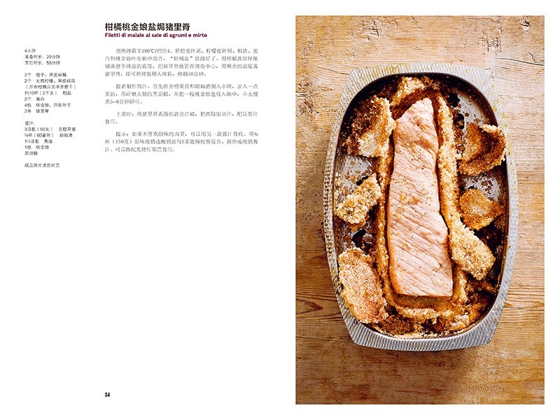 沒有豬肉的義大利菜是不可想像的。義式脆皮五花肉捲(Porchetta)是最著名的義大利豬肉菜餚,其起源於義大利中部,由脫骨的豬五花肉加工成肉捲,再烤製而成。在它的發源地,脆皮五花肉捲通常按片出售,有時也會夾在麵包裡做成三明治,如同家常菜一般普遍。在義大利,豬身上的任何部位都不會被浪費,當地人相信,豬的每個部位都能變成營養豐富的美味食物,或為其他菜餚錦上添花。義大利人民的心靈手巧和對豬精打細算的利用,在「Guanciale」這道菜上可見一斑。它是一種醃製的豬臉頰,可以說是世界上最好也是最美味的培根!簡單的烹飪同樣能製作出美味佳餚,例如烤豬脊肉(見第24頁)或者辛香燴豬肉(見第38頁)。