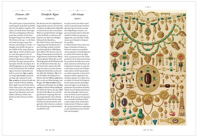 這部文化和美學彙編涵蓋了從中世紀到19 世紀的古典、埃及、希臘、羅馬、伊特魯裡亞、亞洲和中東以及歐洲設計,為藝術家、歷史學家、設計師和製版師提供了主要參考,任何從事裝飾設計和影響的人。